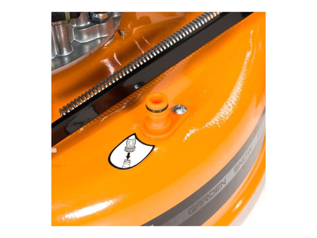Když skončíte se sekáním, plášť a tělo můžete snadno umýt. Stačí připojit zahradní hadici do rychlospojky na plášti sekačky a sekačku spustit.