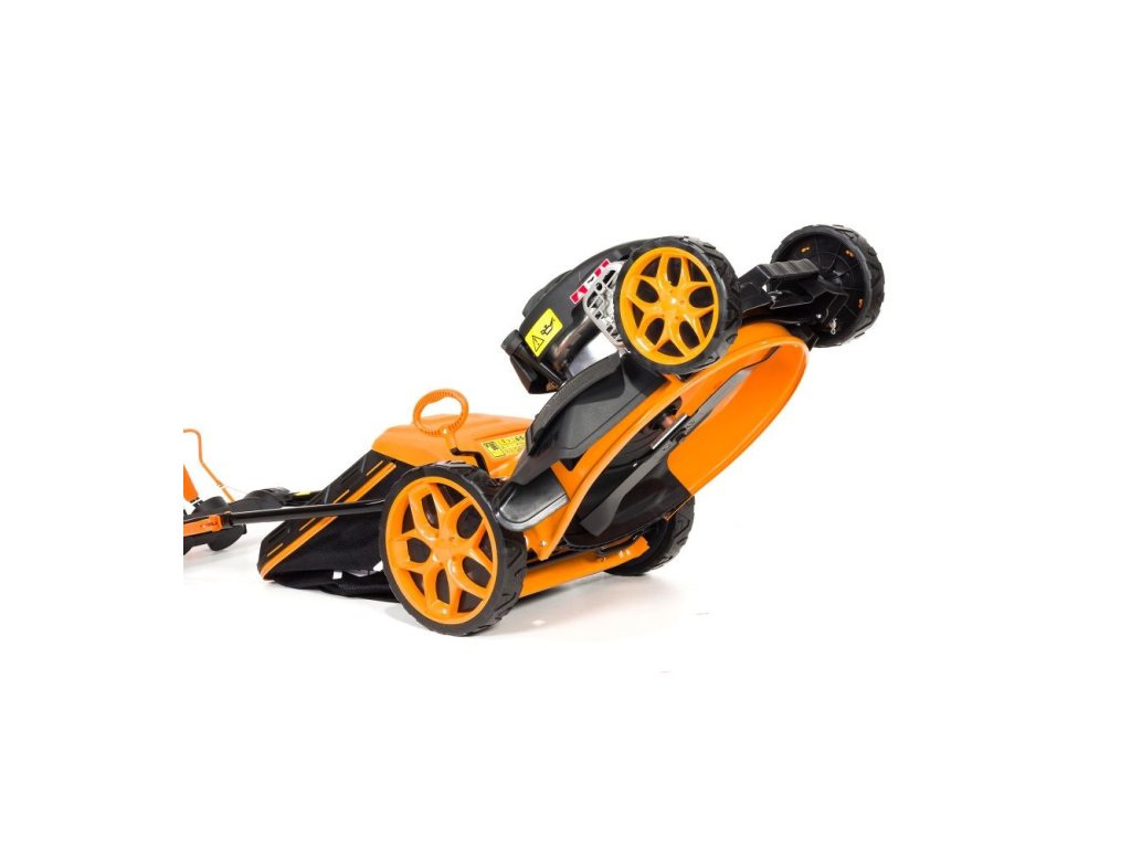 Měkčené a ergonomicky tvarované rukojeti zaručují pohodlí při práci. Pod madlem najdete šikovný držák na pití a drobné věci. Díky velkým předním i zadním kolům s kuličkovými ložisky, která snižují valivý odpor, se vám bude se sekačkou dobře manévrovat.