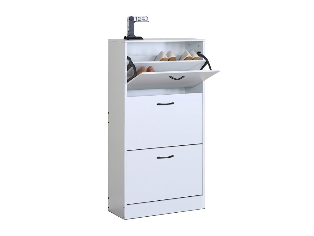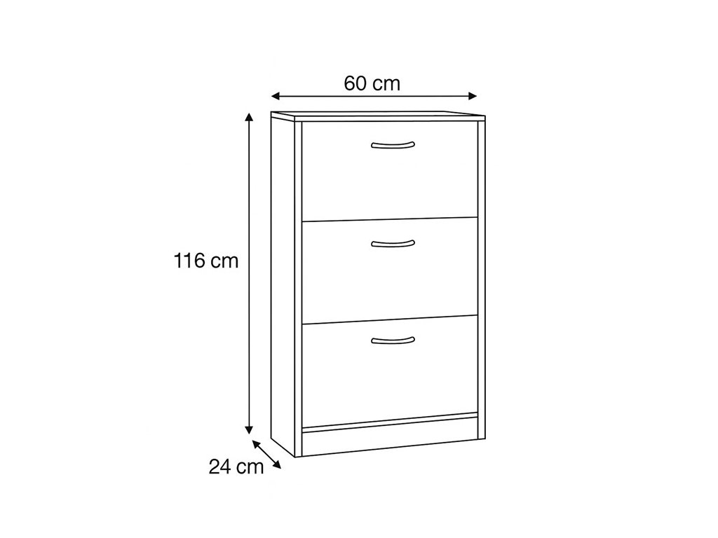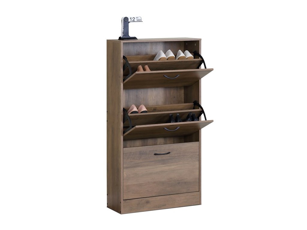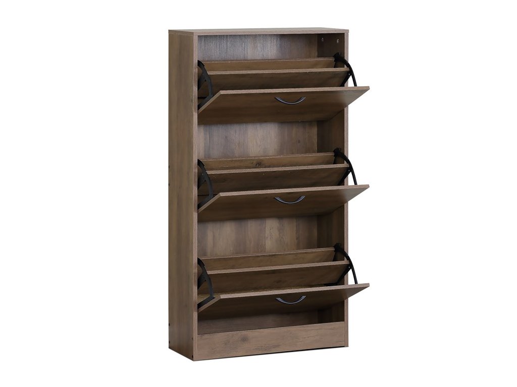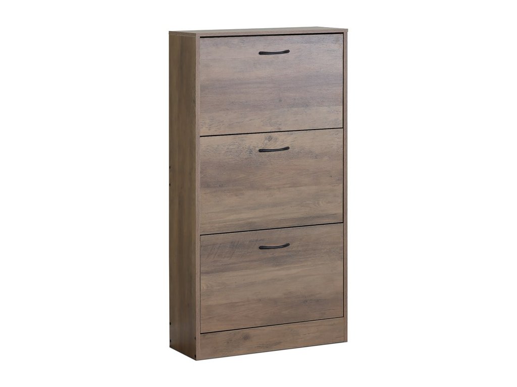 Botník s třemi přihrádkami v dekoru jilmového dřeva je vyroben z MDF desek s povrchovou úpravou, která napodobuje přirozenou strukturu dřeva. Každá přihrádka nabízí dostatek prostoru pro uskladnění obuvi a je opatřena černými kovovými úchytkami pro snadné otevírání. Kompaktní rozměry botníku umožňují jeho umístění i do menších prostor, přičemž pevná konstrukce zajišťuje stabilitu a dlouhou životnost. Praktické řešení v podobě tří samostatných přihrádek pomáhá udržet pořádek a přehlednost v domácnosti. Botník je vhodný do předsíní, chodeb či šaten, kde efektivně využije dostupné místo.