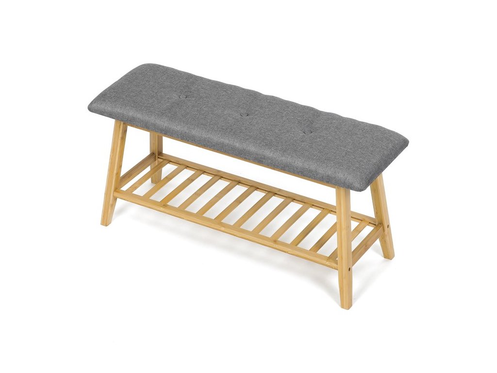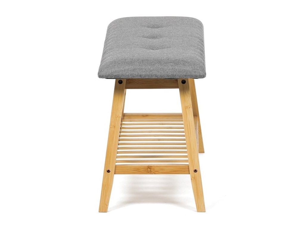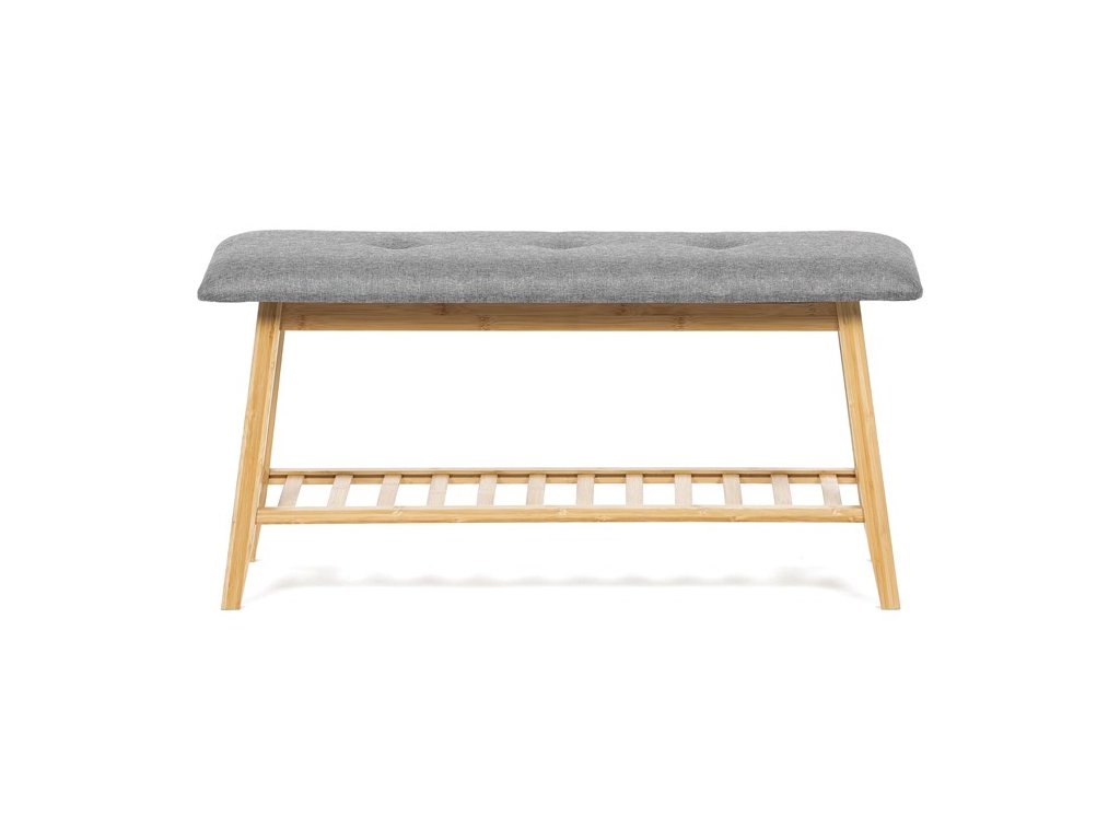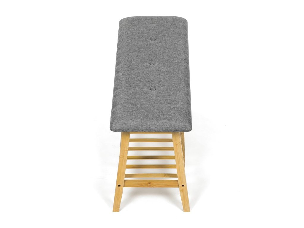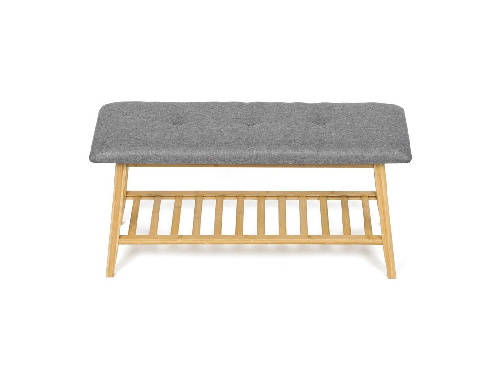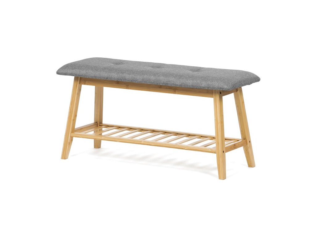 Čalouněný sedák v šedé látce s jemnou strukturou a decentním prošitím poskytuje pohodlné sezení při obouvání i zouvání. Pod sedací plochou se nachází praktická police z bambusových lamel, která umožňuje přehledné uložení obuvi nebo jiných drobných předmětů. Stabilní konstrukce s mírně šikmými nohami zajišťuje bezpečné používání a dlouhou životnost.
