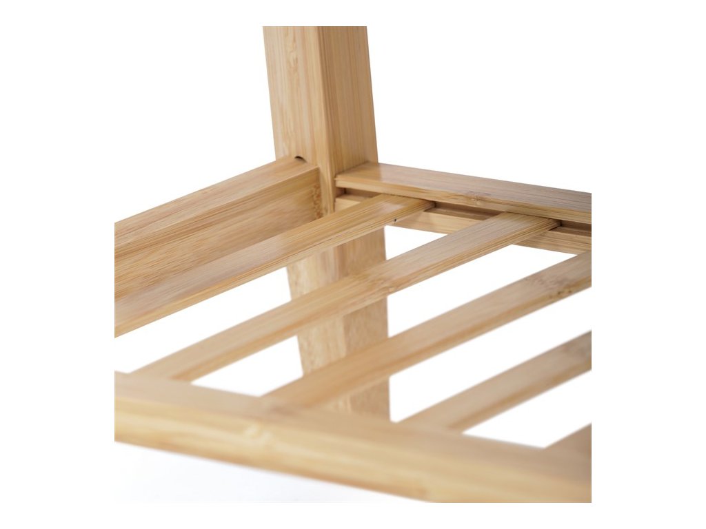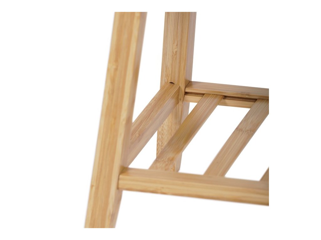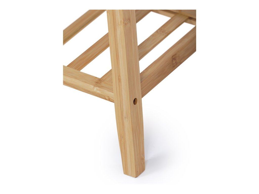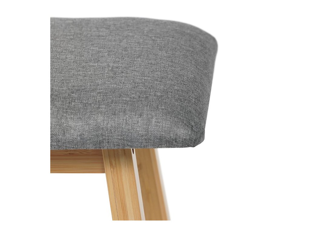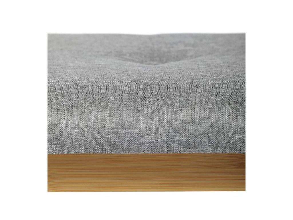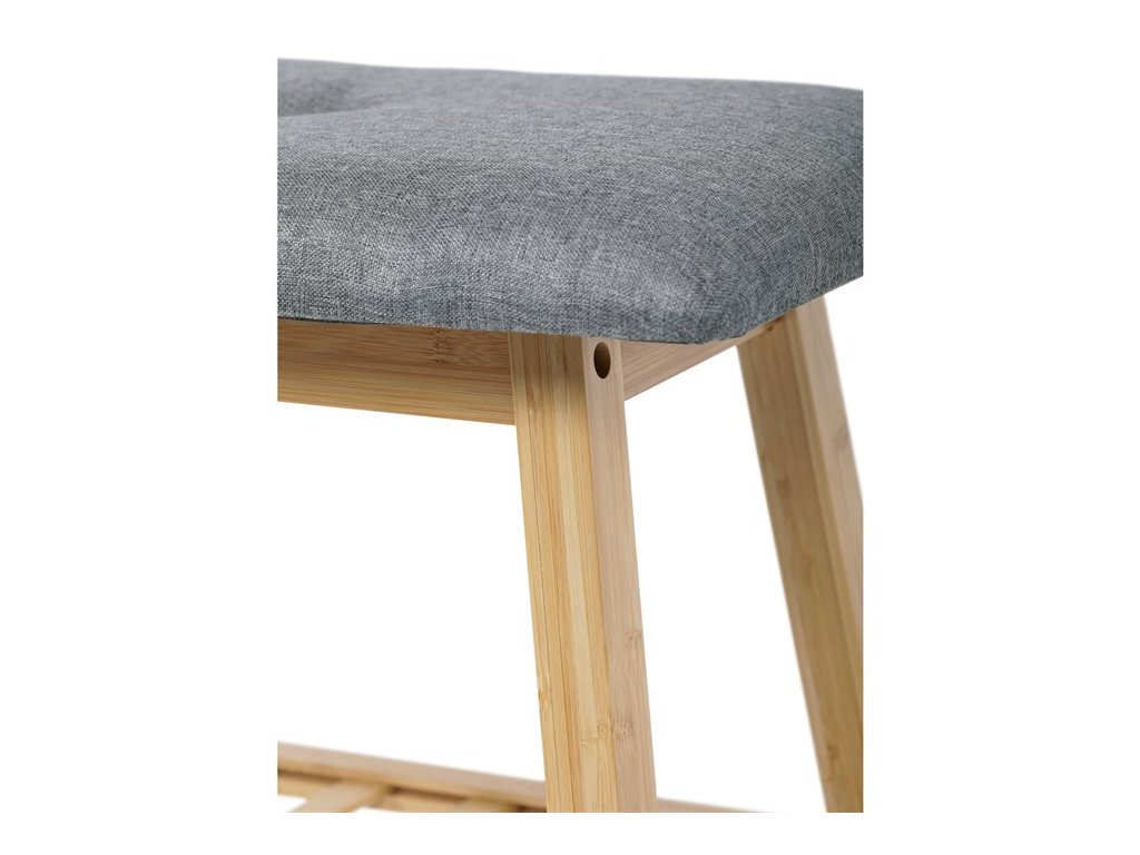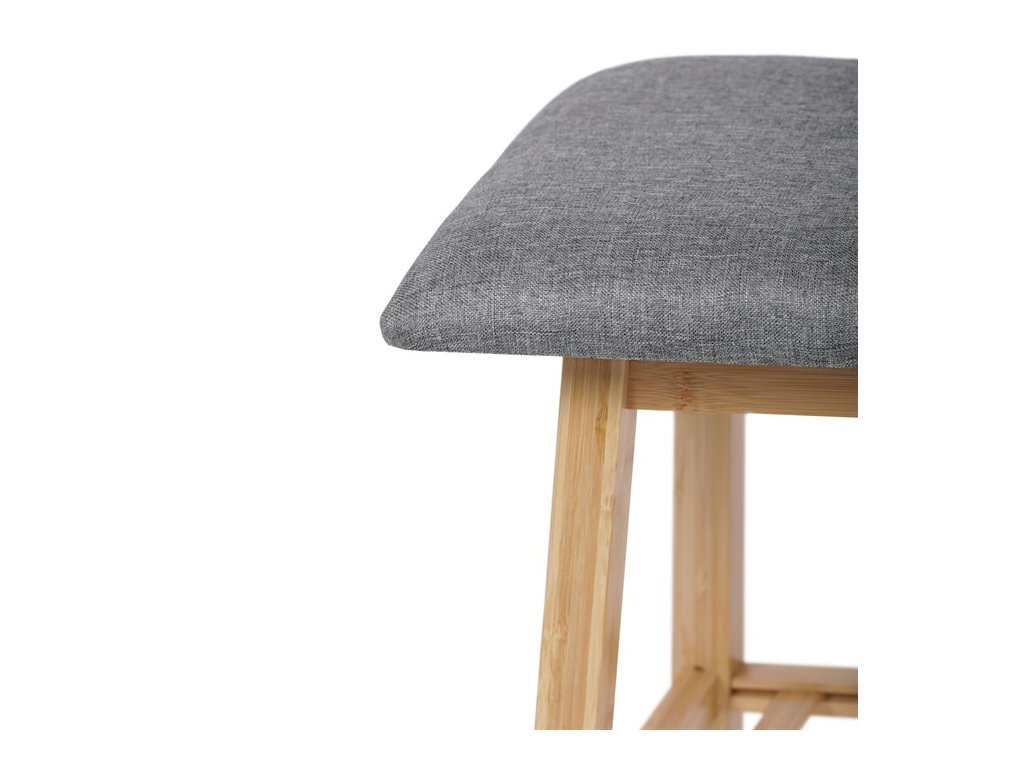 Čalouněný sedák v šedé látce s jemnou strukturou a decentním prošitím poskytuje pohodlné sezení při obouvání i zouvání. Pod sedací plochou se nachází praktická police z bambusových lamel, která umožňuje přehledné uložení obuvi nebo jiných drobných předmětů. Stabilní konstrukce s mírně šikmými nohami zajišťuje bezpečné používání a dlouhou životnost.