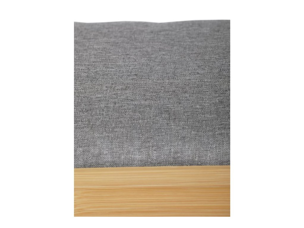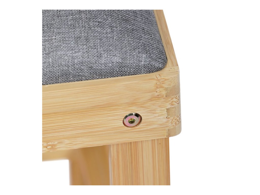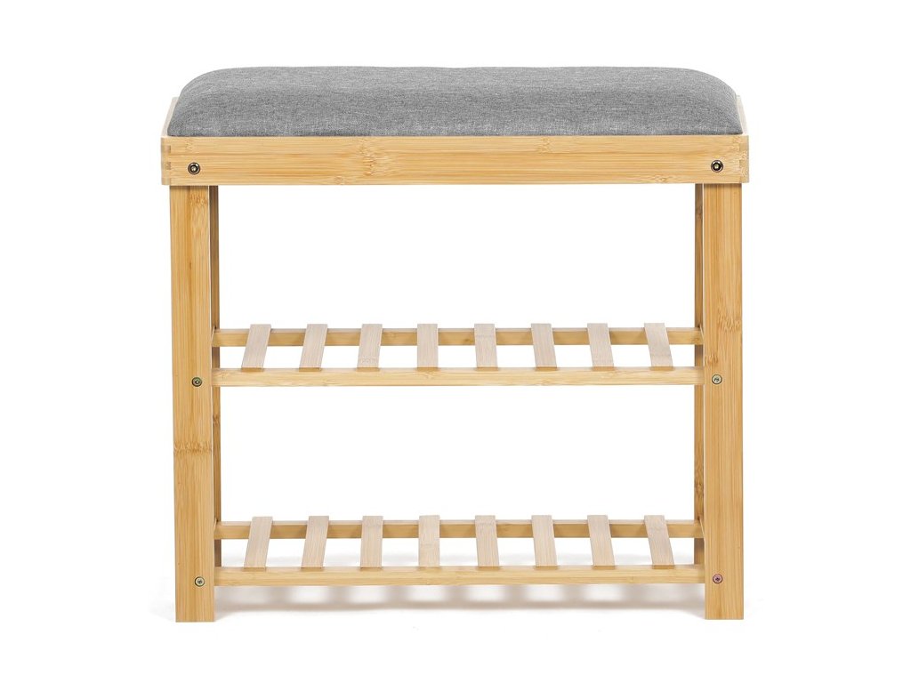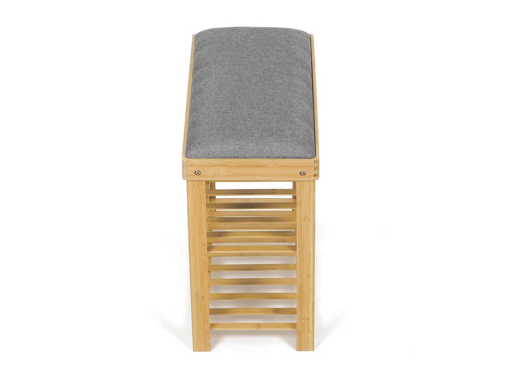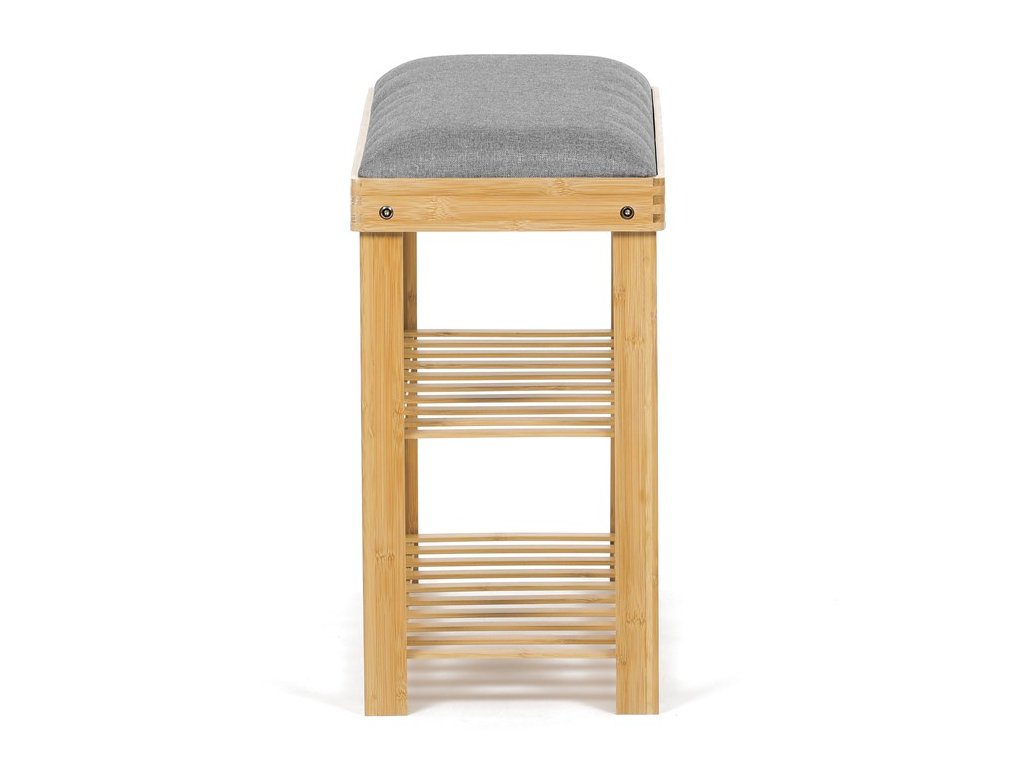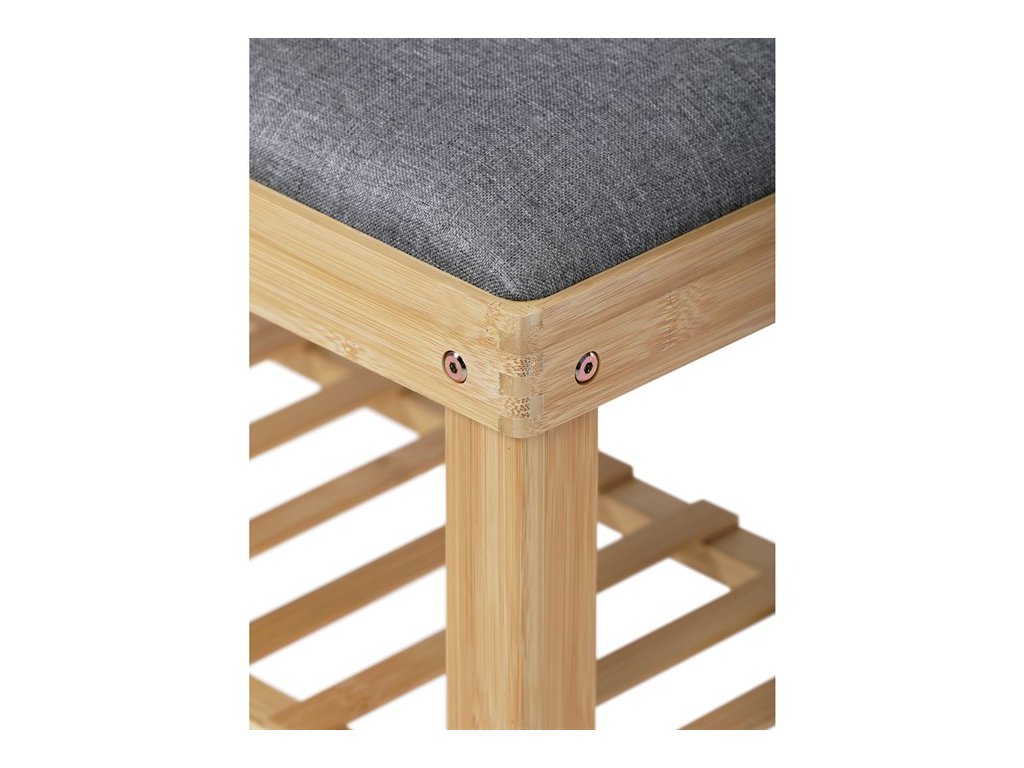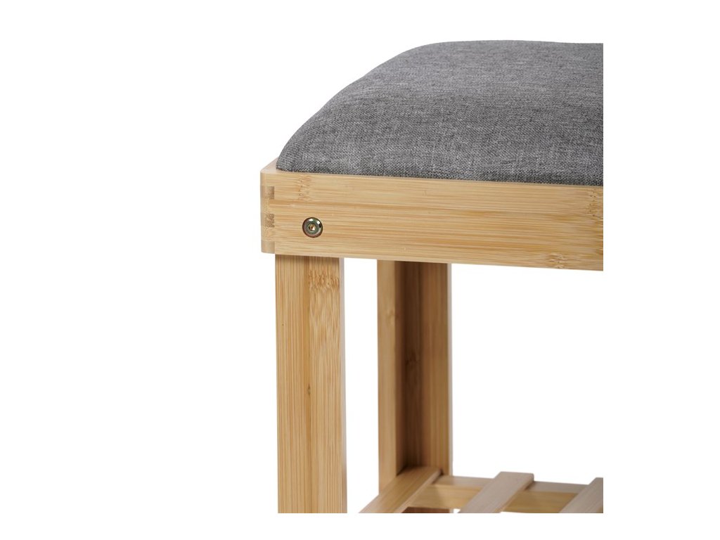 Měkký sedák čalouněný šedou látkou s jemnou strukturou poskytuje komfort při obouvání. Pod ním se nachází dvě otevřené police z bambusových latí, které umožňují přehledné uložení obuvi a díky své konstrukci zajišťují optimální cirkulaci vzduchu. Kovové spojovací prvky dodávají rámu vyšší stabilitu a dlouhou životnost.
