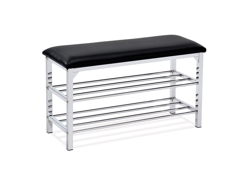 Botník VINNY s dvěma policemi je ideálním doplňkem do předsíně či chodby. Stabilní kovová konstrukce s chromovaným povrchem zaručuje dlouhou životnost a snadnou údržbu. Horní čalouněný sedák potažený černou ekokůží poskytuje komfortní místo k sezení při obouvání, zatímco dvě otevřené police umožňují přehledné uložení obuvi. Díky kompaktním rozměrům se botník hodí i do menších prostor a svým univerzálním designem snadno zapadne do moderních i klasických interiérů.