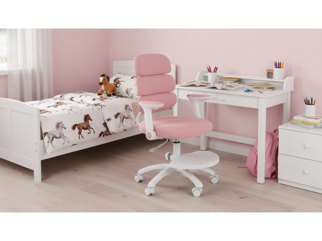 Díky výškově nastavitelné opěrce na nohy a sklápěcím područkám s možností demontáže se židle snadno přizpůsobí růstu dítěte i různým pracovním potřebám. Stabilitu zaručuje pevný kříž z tvrzeného plastu s pogumovanými kolečky o průměru 50 mm, která jsou šetrná k podlaze a vybavena automatickou brzdou aktivující se při zatížení.