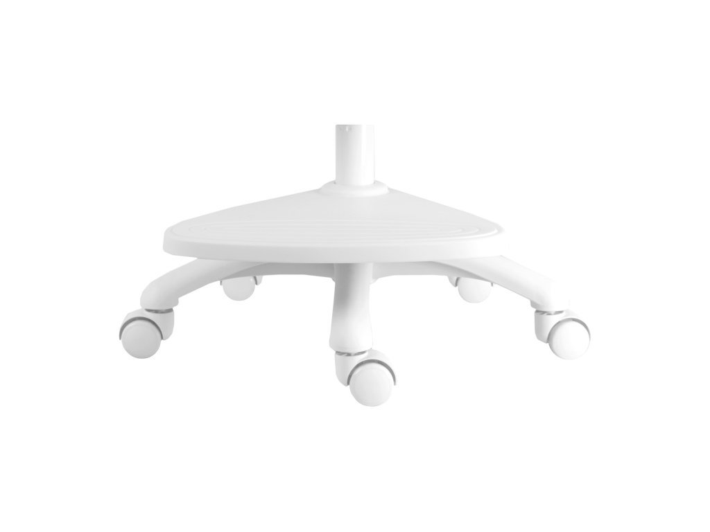Stabilní základ tvoří pětiramenný kříž z tvrzeného plastu, doplněný o pogumovaná kolečka o průměru 50 mm. Ta jsou tichá, šetrná k podlaze a mají integrovanou brzdu, která se aktivuje při zatížení – díky tomu je židle maximálně bezpečná i pro menší děti.