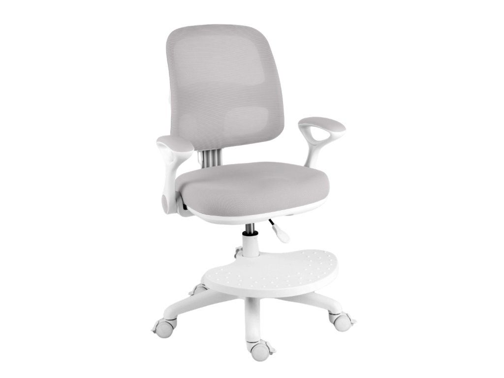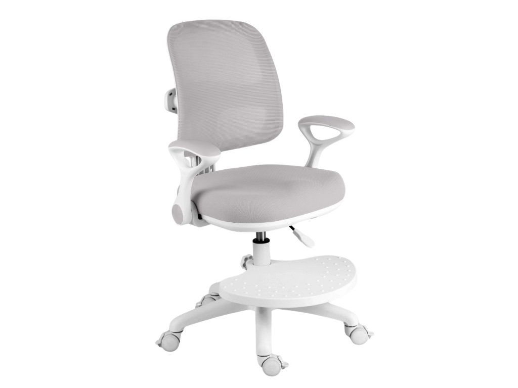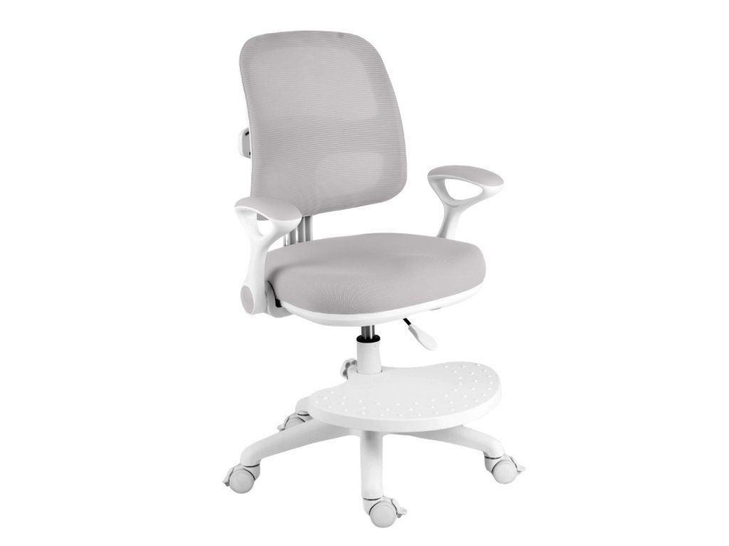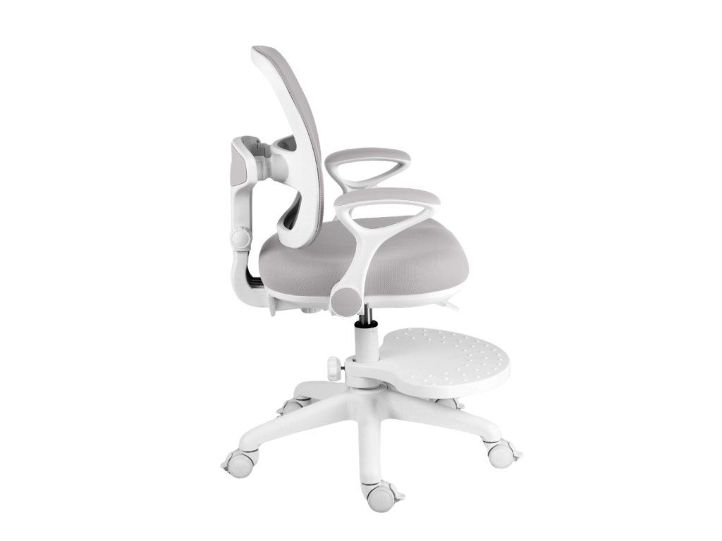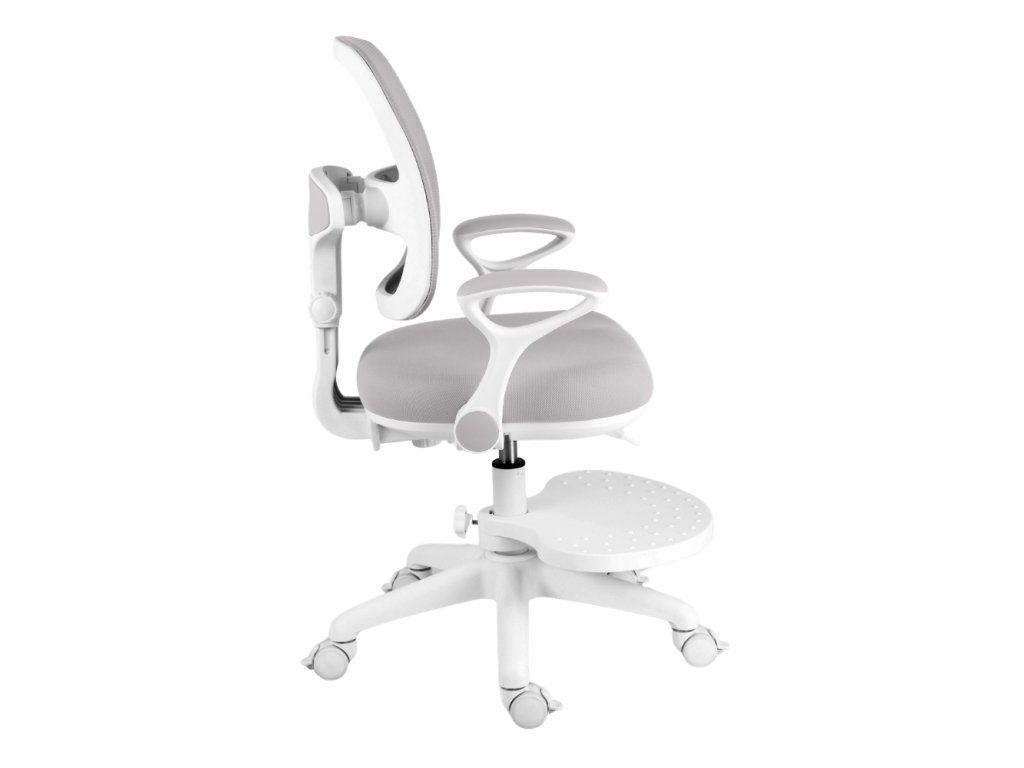 Součástí židle je praktická podnožka, která poskytuje oporu nohám a přispívá ke správnému sezení, zejména u menších dětí. Stabilní základna s kolečky zajišťuje snadný pohyb i bezpečné používání.