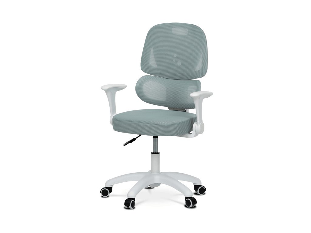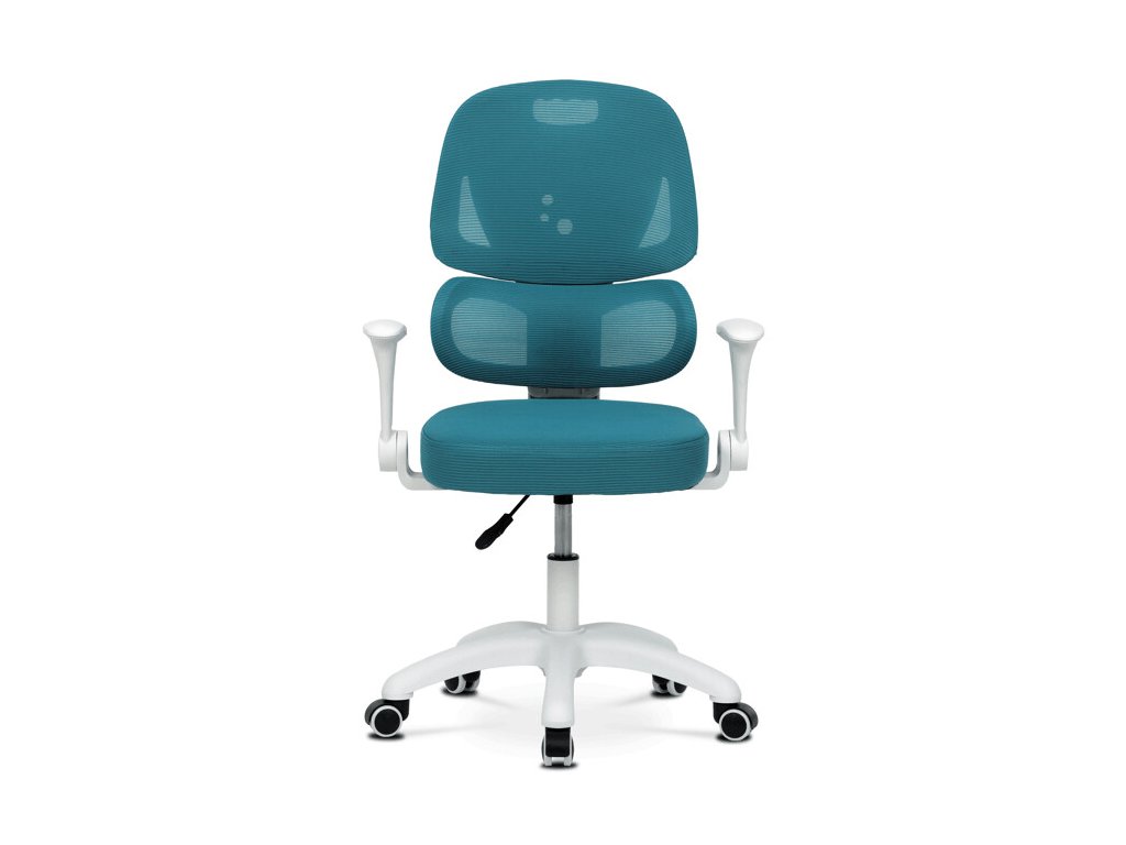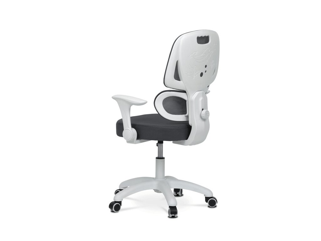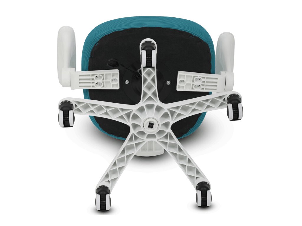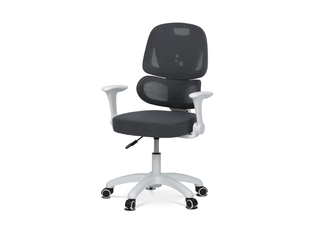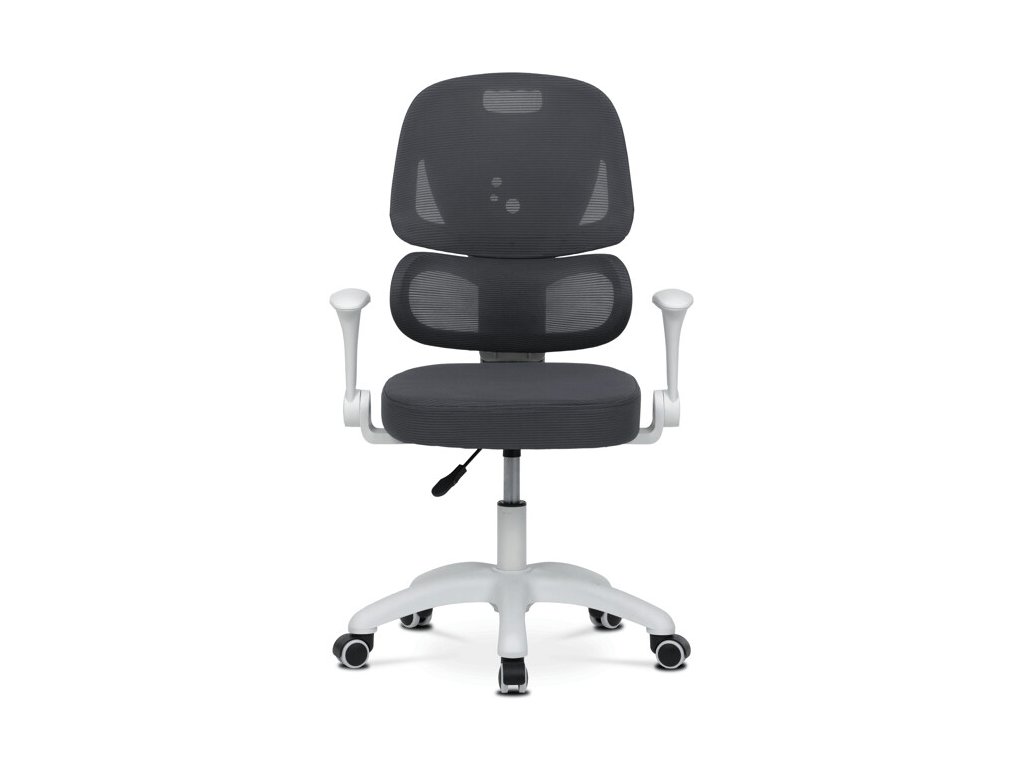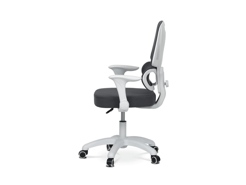 Praktickým prvkem jsou odklápěcí područky, které umožňují lepší přístup ke stolu, šetří místo a zvyšují pohodlí při používání. Stabilní plastový kříž v bílé barvě dodává židli lehkost, ale zároveň i pevnost a odolnost. Kolečka určená pro tvrdé podlahy umožňují plynulý pohyb po místnosti bez rizika poškrábání.