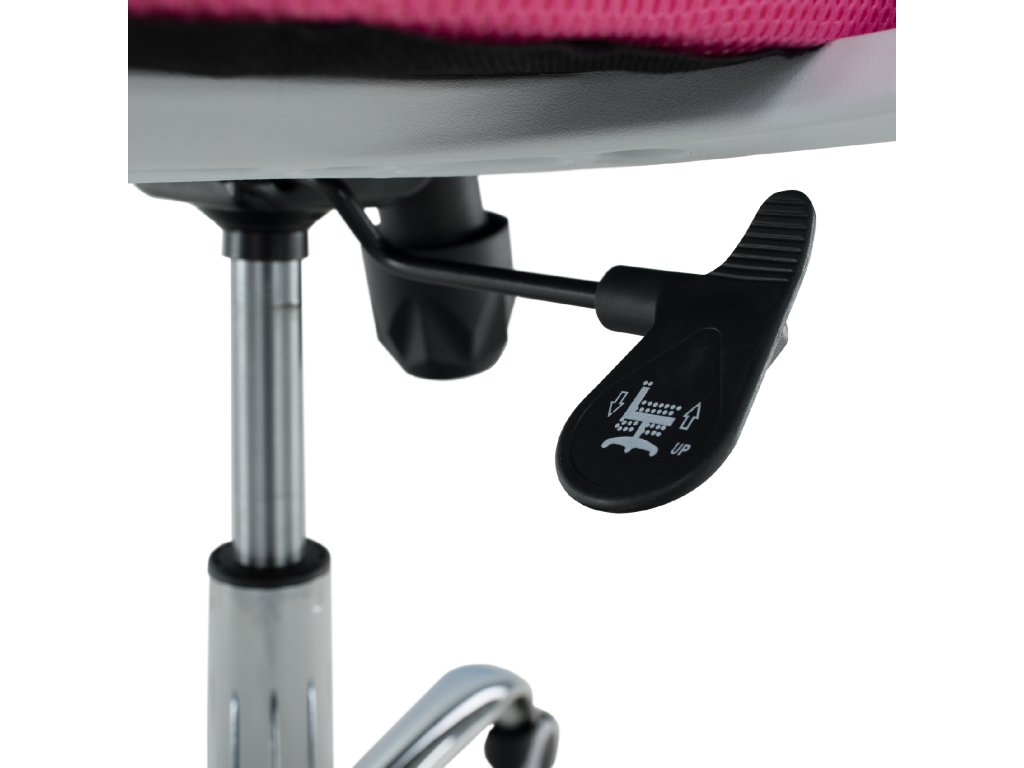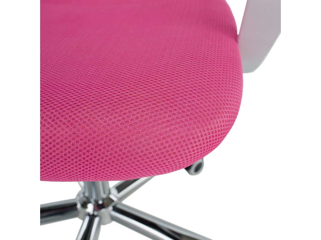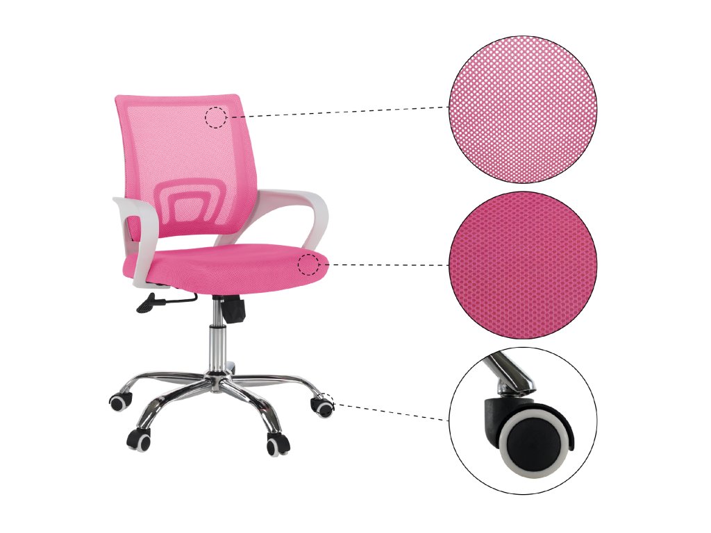Dětská židle DREAMY spojuje styl, ergonomii a funkčnost. Díky čalounění v růžové síťovině působí svěže a hravě, přičemž prodyšný materiál zajišťuje plynulou cirkulaci vzduchu a pohodlí i při delším sezení. Základ tvoří pevná plastová konstrukce v bílé barvě doplněná kovovými prvky v chromu, které dodávají židli stabilitu i elegantní vzhled.