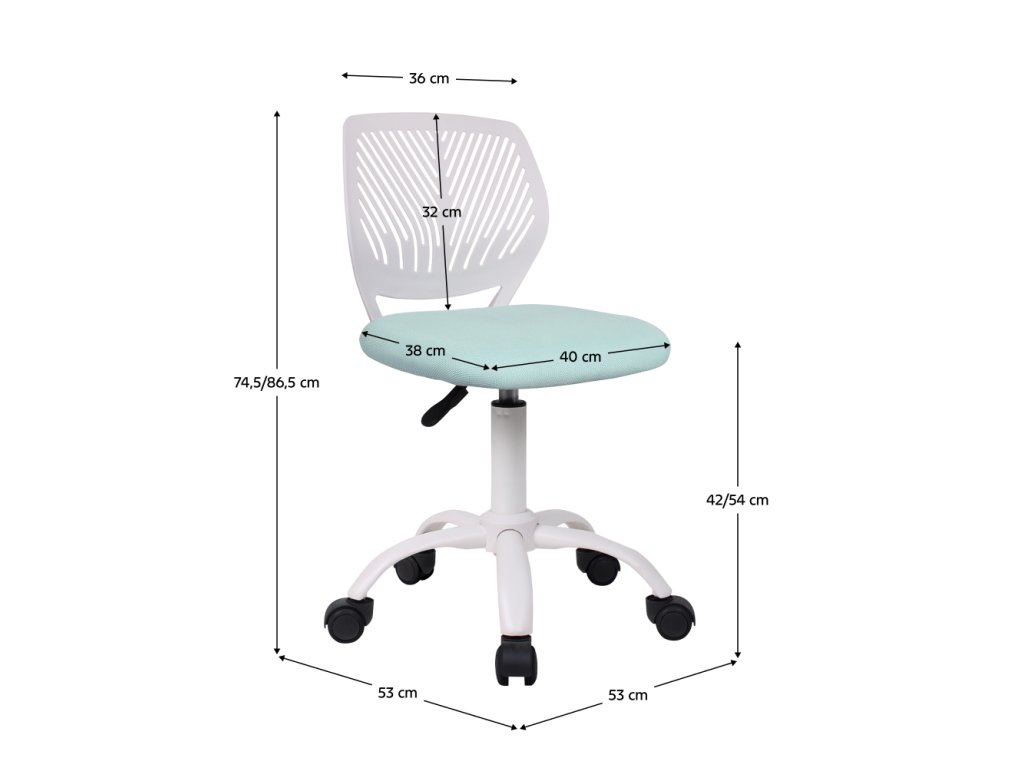 Židle je otočná, disponuje výškově nastavitelným sedákem (42–54 cm) a stabilní kovovou konstrukcí s chromovanou podstavou. Díky kolečkům je snadno přemístitelná a ideální pro každodenní školní povinnosti i volnočasové aktivity. PIXIE v neomint-bílé barvě je stylovým a funkčním doplňkem studentského pokoje.