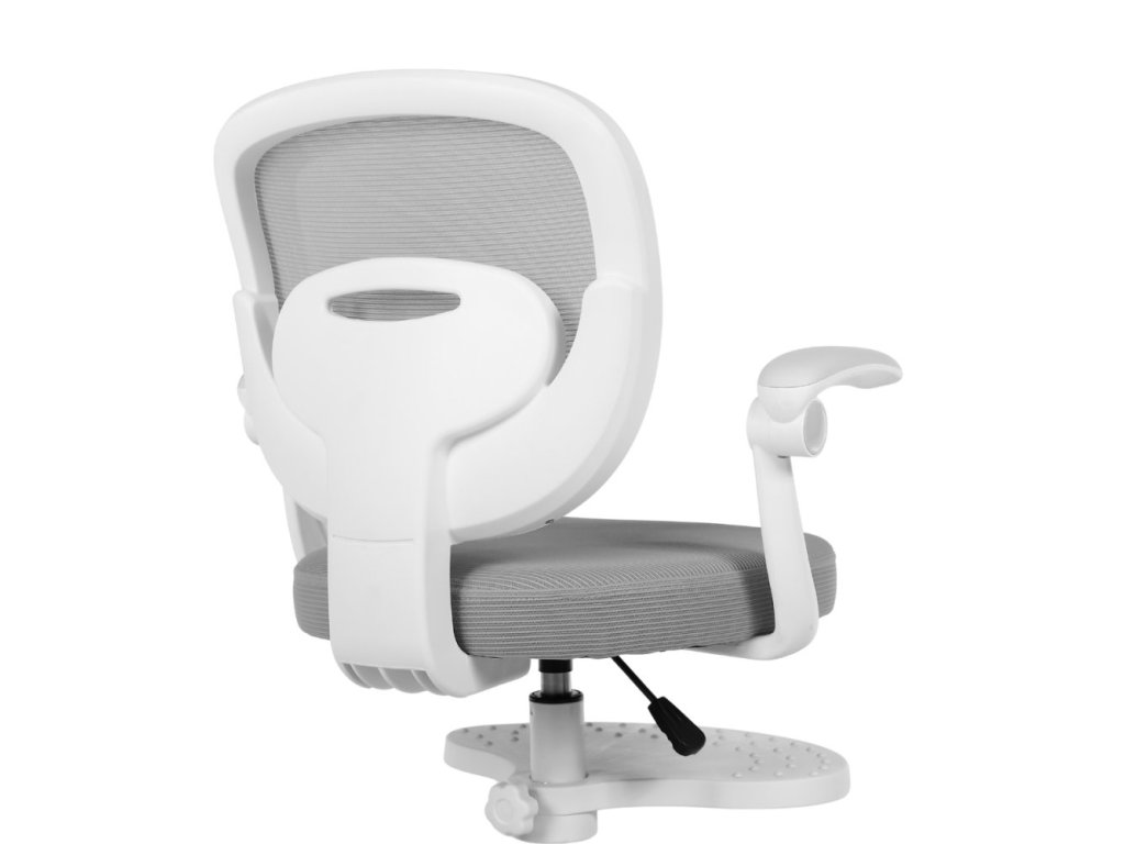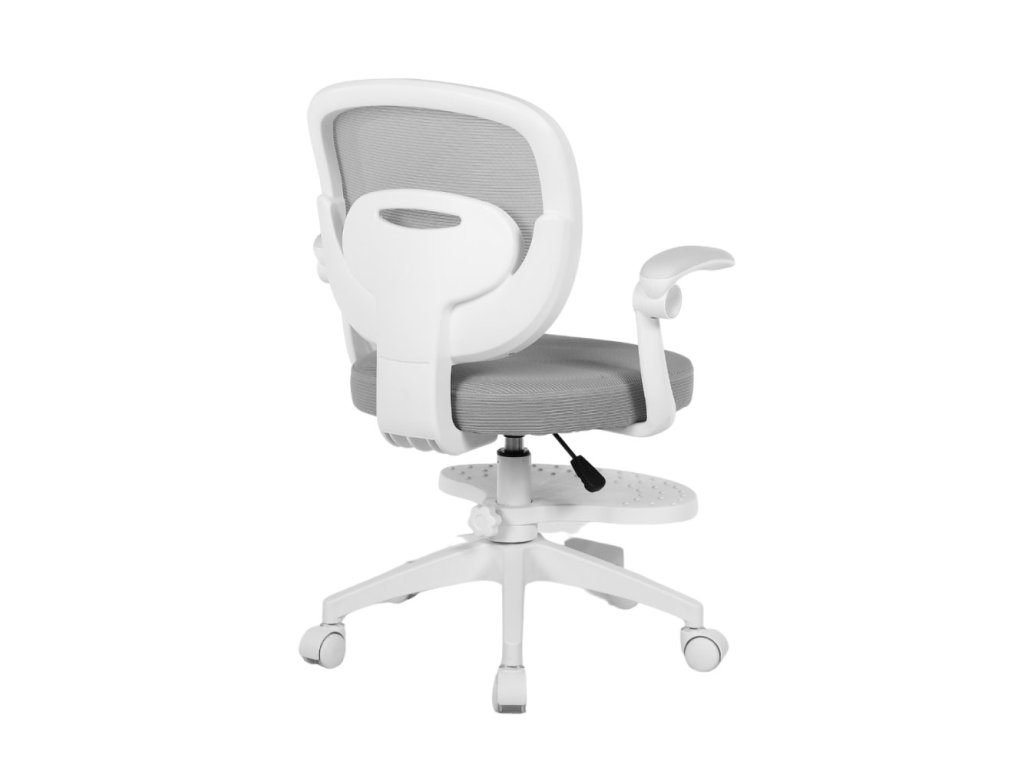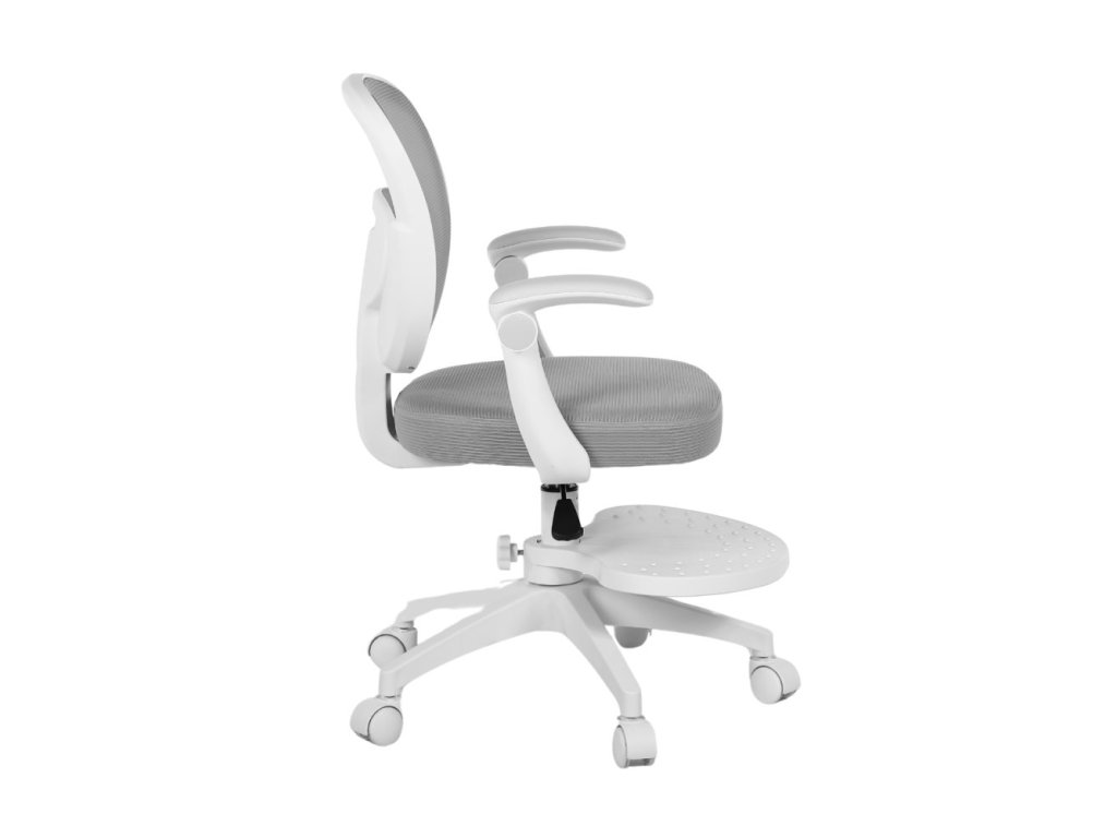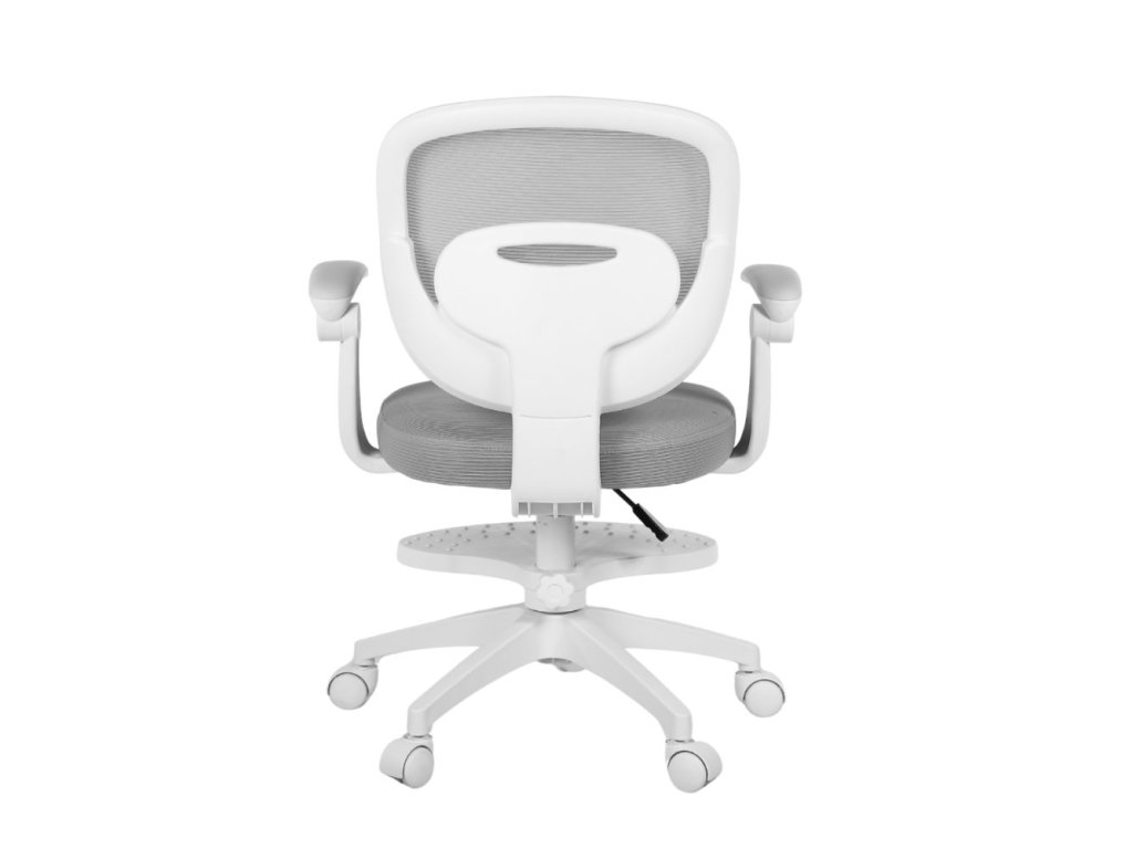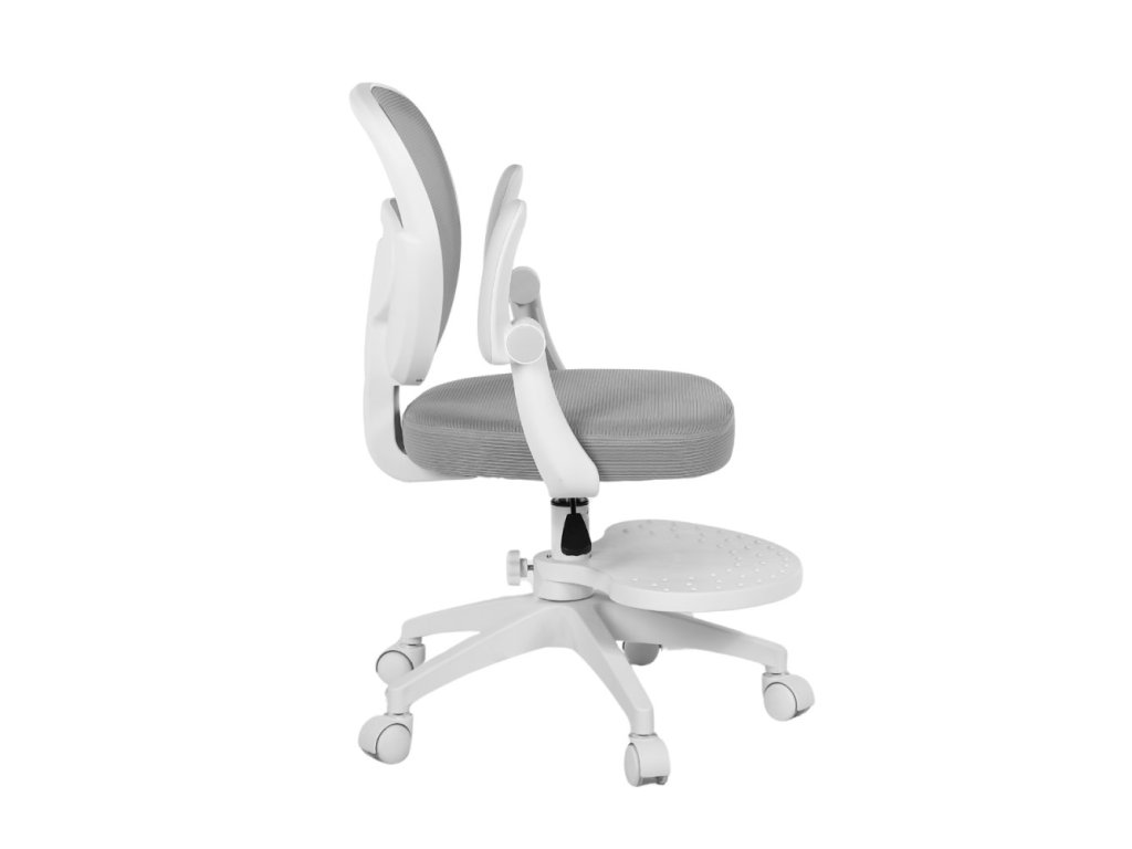 Součástí židle jsou vyklápěcí omyvatelné područky, díky kterým mohou děti pohodlně odpočívat nebo je jednoduše vyklopit nahoru, pokud při práci překážejí. Výškově nastavitelná otočná podnožka poskytuje oporu zejména menším dětem — a pokud ji nebudete potřebovat, lze ji snadno demontovat. Záda židle jsou tvořena prodyšnou MESH síťovinou, která umožňuje cirkulaci vzduchu a brání přehřívání zad.