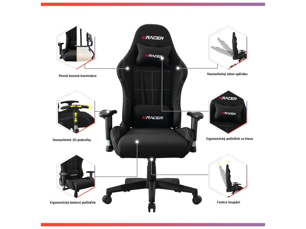 Herní židle MRacer REGALIA – černá, nadčasový styl a ergonomické pohodlíHerní židle MRacer REGALIA v černém látkovém provedení nabízí elegantní vzhled a praktické funkce pro dlouhé hodiny hraní, práce i studia. Díky vysokému čalouněnému opěráku, pohodlnému sedáku s bočnicemi a polštářkům pod hlavu a bedra poskytuje zdravou podporu páteře i při sezení 8 hodin a více.