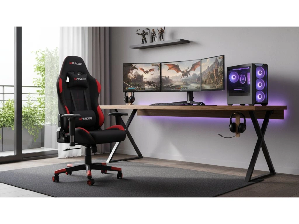 Herní židle MRacer REGALIA – černo-červená s dynamickým sportovním vzhledemHerní židle MRacer REGALIA v černo-červeném látkovém provedení je navržena pro dlouhé herní maratony, práci i studium. Ergonomicky tvarovaný vysoký opěrák, pohodlný čalouněný sedák s bočnicemi a polštářky pod hlavu a bedra poskytují zdravou podporu zad a komfort i při sezení 8 hodin a více.