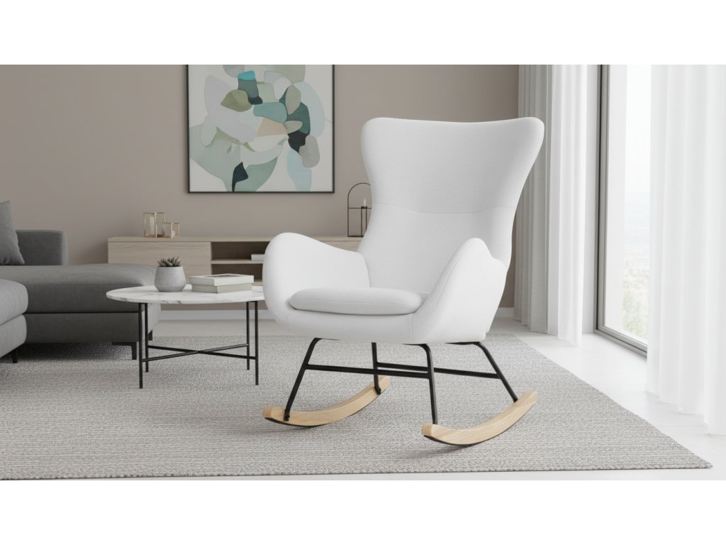 Houpací křeslo FURU vnese do vašeho interiéru nádech elegance a klidné atmosféry. Díky kombinaci čistě bílé hladké látky a přírodních dřevěných noh působí sofistikovaně a dokonale se hodí do moderně laděných prostor.
