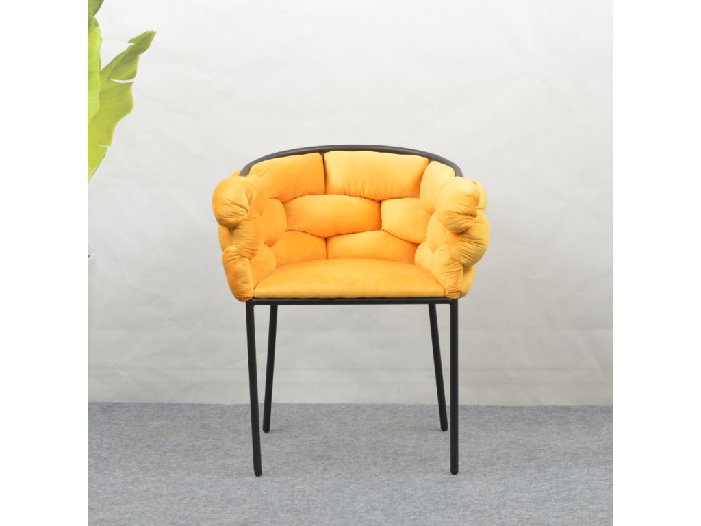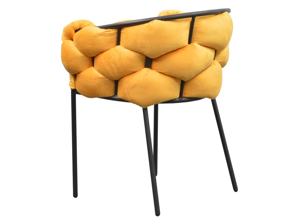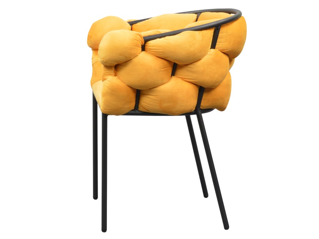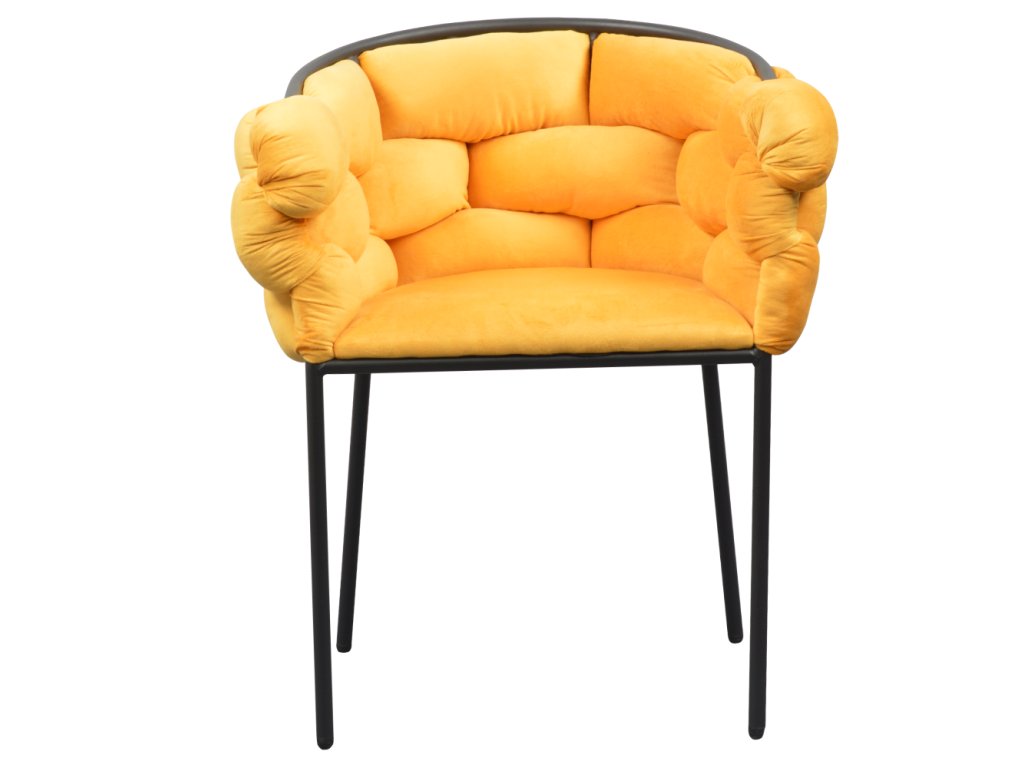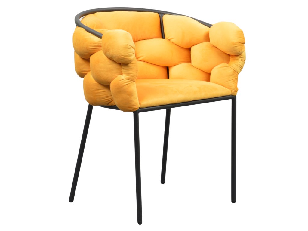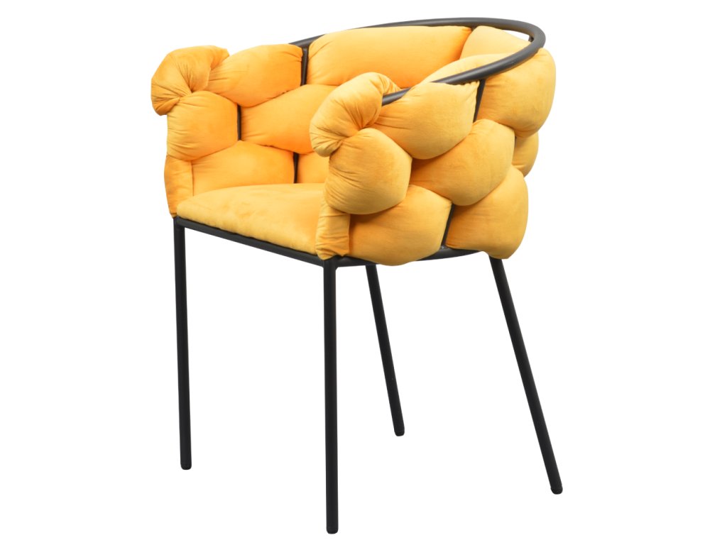 Sytě žlutý odstín dodává interiéru energii a svěžest, zatímco černé kovové nohy vytvářejí moderní kontrast. Díky tvaru s područkami a plně čalouněnému opěradlu nabídne vysoký komfort při každém posezení.