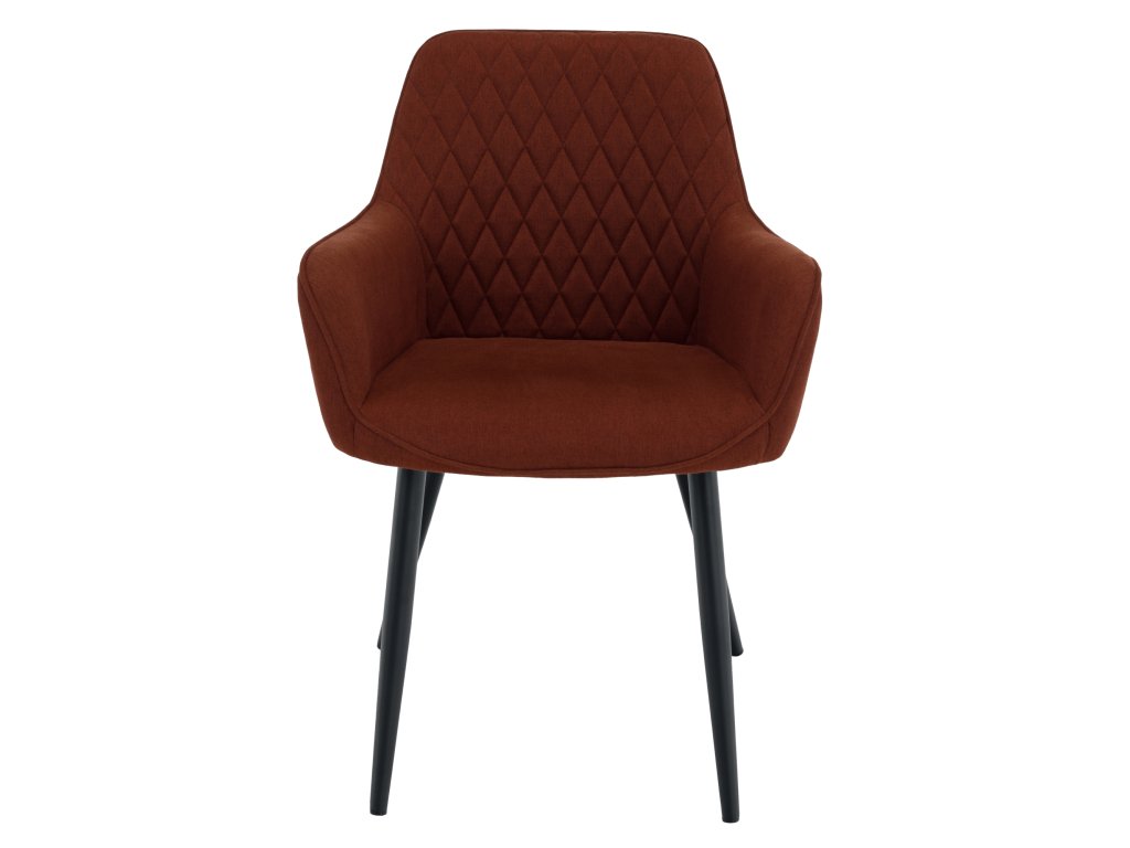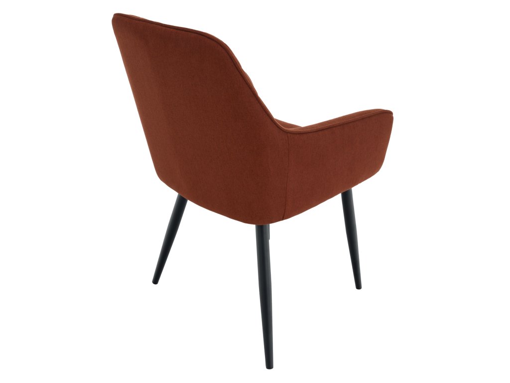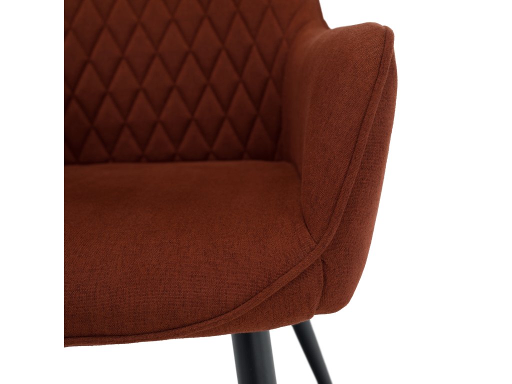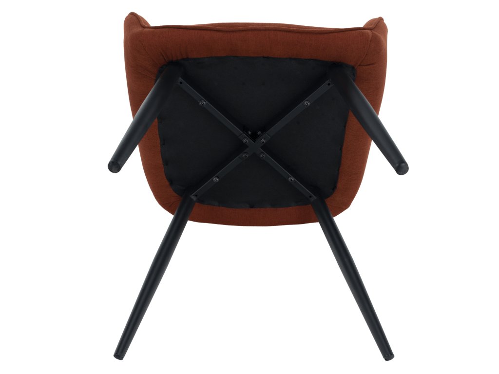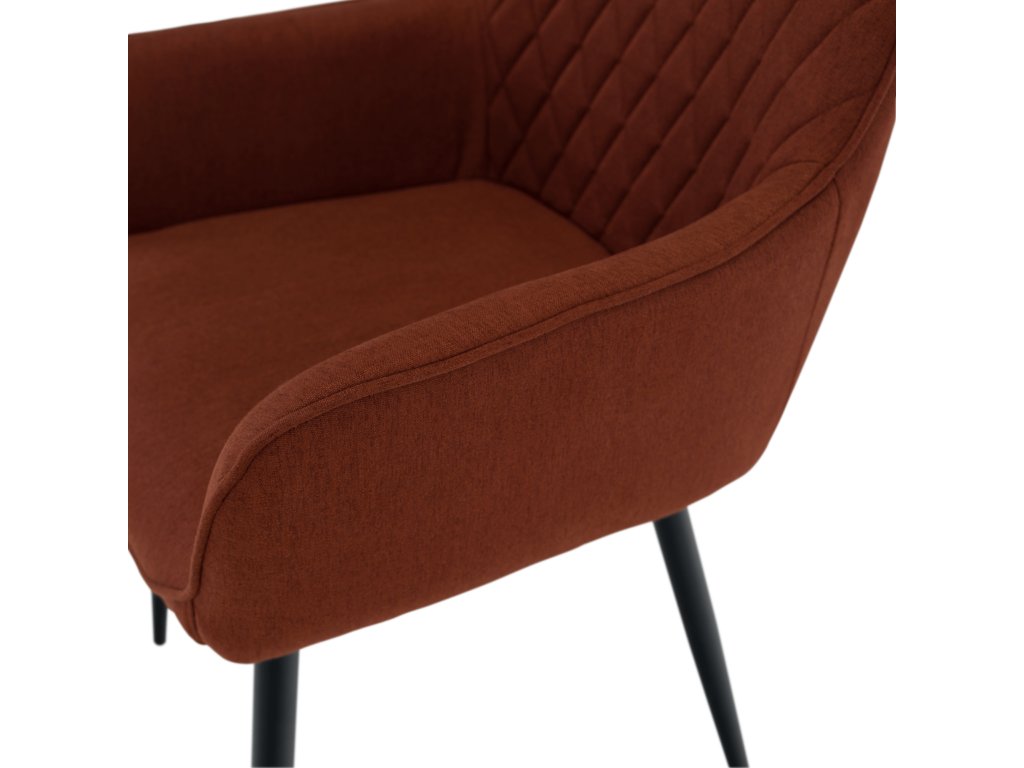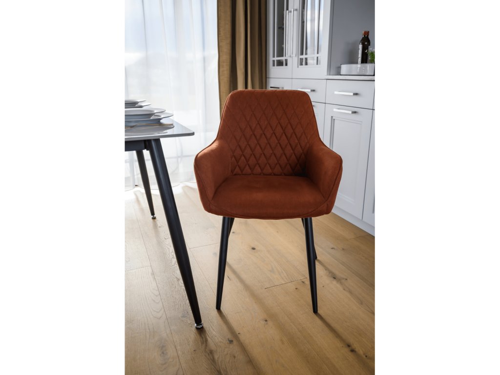 Křeslo EMERA je navrženo pro maximální komfort – měkké čalounění, pohodlný sedák a integrované opěrky na ruce vám zajistí příjemné posezení při jídle, práci nebo relaxaci. Zádová opěrka s dekorativním prošitím dodává celku na šarmu a originalitě. Kovové nohy v černém provedení zajišťují vysokou stabilitu, pevnost a stylový kontrast s teplým odstínem potahu.