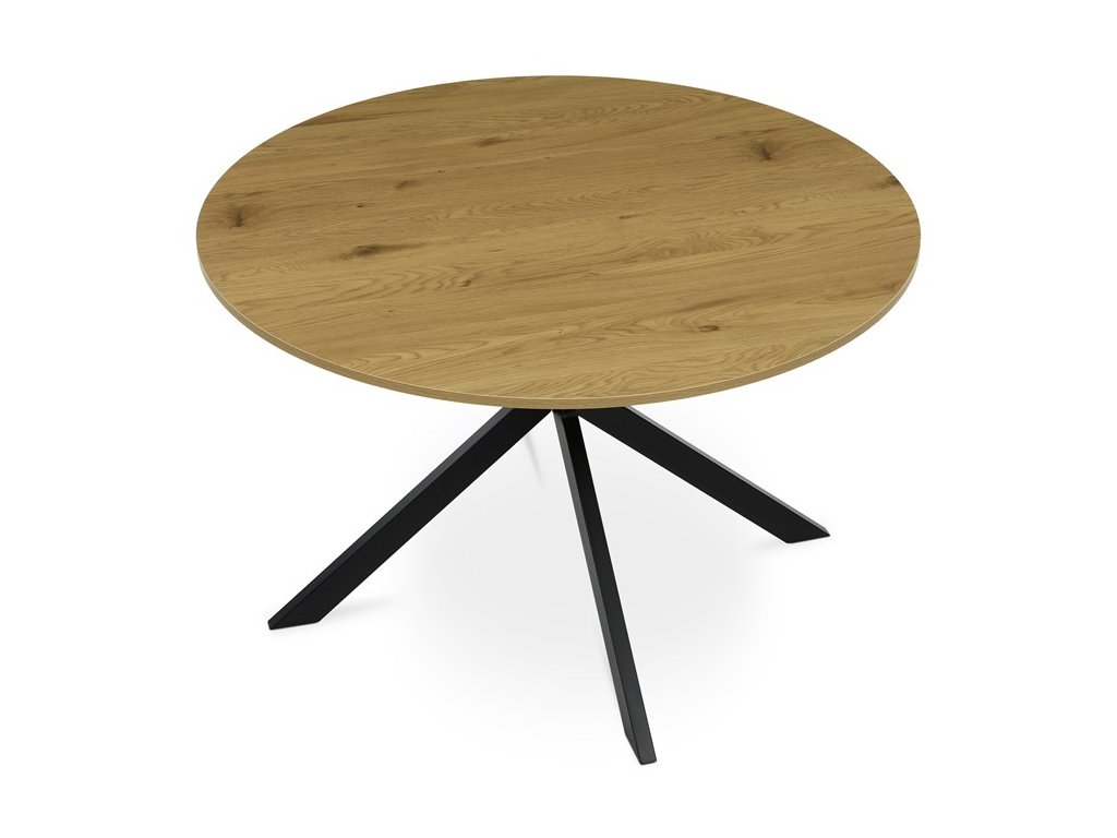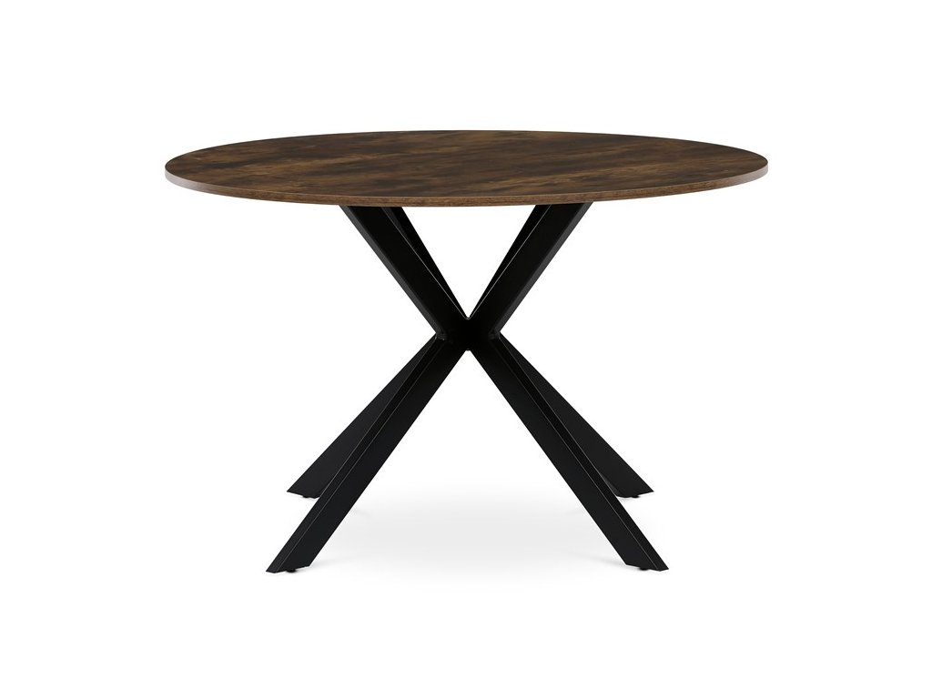 Jídelní kulatý stůl NARO spojuje přírodní vzhled desky v dekoru divokého dubu nebo starého dřeva s robustní kovovou podnoží. Deska z MDF o průměru 120 cm je opatřena ABS hranou, která chrání před poškozením a zajišťuje dlouhou životnost. Čtyři široké nohy uspořádané do kříže dodávají celku stabilitu a jsou ošetřeny práškovým lakem pro vyšší odolnost vůči korozi a mechanickému opotřebení. Praktické rektifikační nožky umožňují snadné vyrovnání na nerovném povrchu a zabraňují kývání stolu. Kulatý tvar podporuje pohodlné stolování a příjemnou komunikaci mezi všemi sedícími. Tento stůl je ideální do moderních domácností i komerčních interiérů, kde je důležitá kombinace estetiky a funkčnosti.