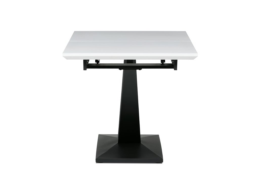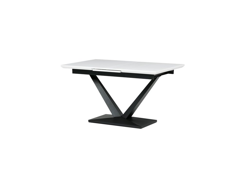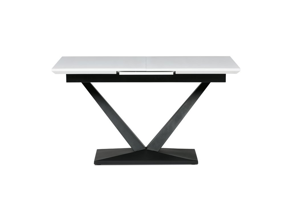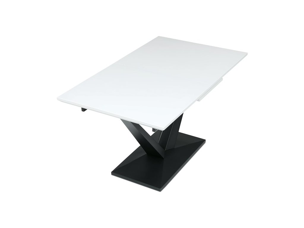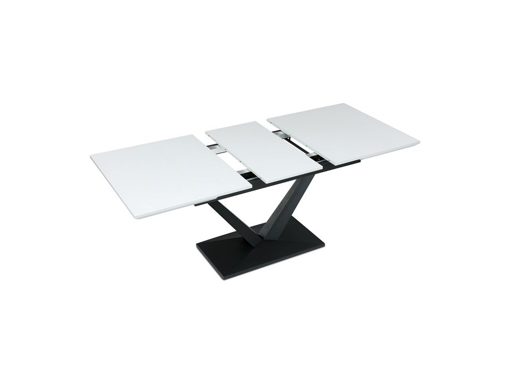 Rozkládací jídelní stůl TRENA je ideální volbou pro ty, kteří hledají kombinaci moderního vzhledu a praktičnosti. Dominantním prvkem je robustní centrální noha ve tvaru písmene V, která dodává celé konstrukci stabilitu i atraktivní vzhled. Deska je vyrobena z kvalitního MDF materiálu v bílé matné úpravě, která je odolná proti poškození a snadno se čistí, takže je vhodná pro každodenní stolování.