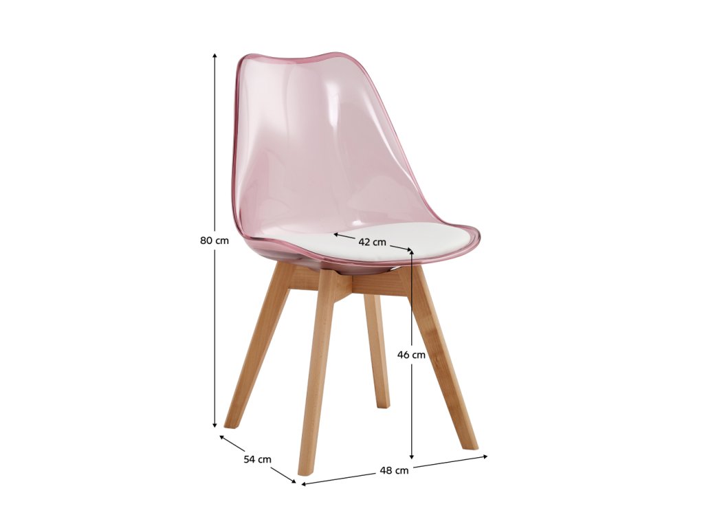 Sedací část je vyplněna měkkou vložkou a potažena kvalitní ekokůží, což zaručuje mimořádně pohodlné sezení i při delším používání. Transparentně růžové opěradlo působí jemně, romanticky a vnáší do prostoru svěží nádech originality. Bukové nohy zase dodávají židli přirozený charakter a stabilitu.