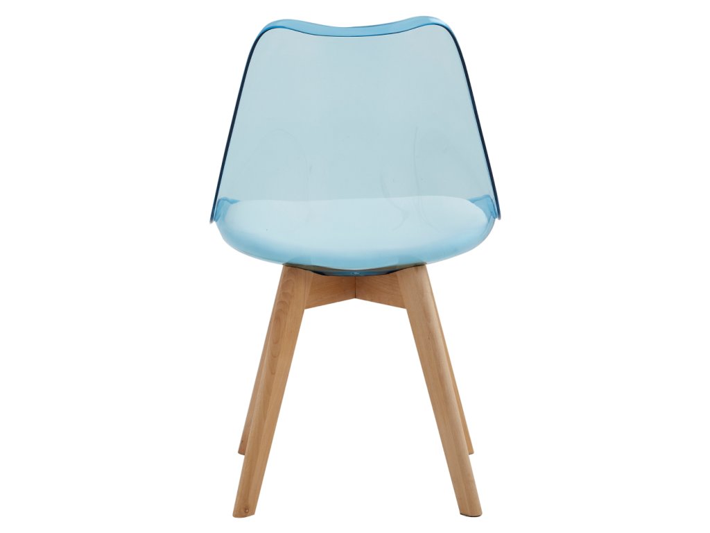 Jídelní židle SKANDI v transparentně modrém provedení přináší do interiéru svěžest, originalitu a moderní design. Její vzhled v sobě spojuje skandinávskou jednoduchost s odvážným nádechem inovace. Kombinace akrylového opěradla, čalouněného sedáku z ekokůže a pevných bukových nohou vytváří jedinečný celek, který zaujme na první pohled.