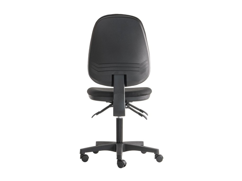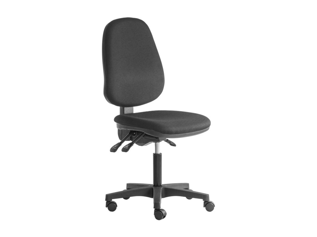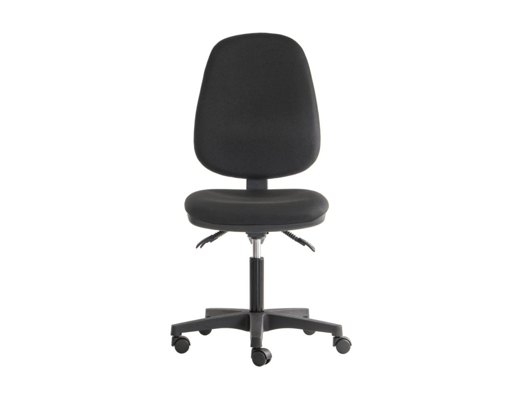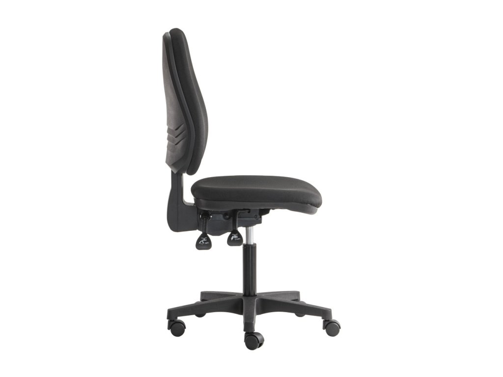 Sedák je čalouněný kvalitní látkou Bondai 8033 v černé barvě, která je odolná proti oděru až do 150 000 cyklů. Stabilní konstrukci zajišťuje plochý nylonový kříž Ø 60 cm s plastovými kolečky vhodnými na koberce. Židle je navržena bez područek, což usnadňuje pohyb a zasouvání pod pracovní stůl. S nosností 120 kg a zárukou 2 roky představuje CARLA spolehlivou volbu pro kanceláře i domácí využití.