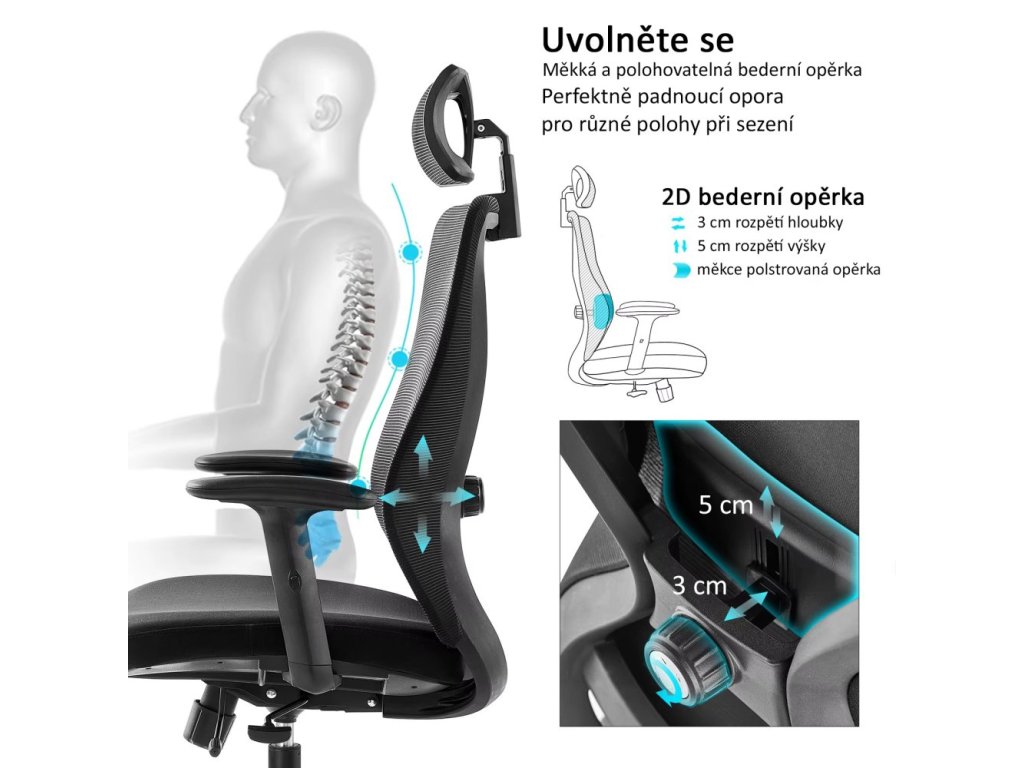 Sedák s nastavitelnou hloubkou (+5 cm) se přizpůsobí délce nohou uživatele, takže se v židli pohodlně usadí každý. Pro dokonalé odlehčení páteře je zde polstrovaná bederní opěrka, která se dá nastavit nejen výškově, ale i hloubkově – přesně podle tvaru zad. Nechybí ani výškově a úhlově nastavitelný podhlavník, který uvolní krční oblast a přispěje ke správnému držení těla.