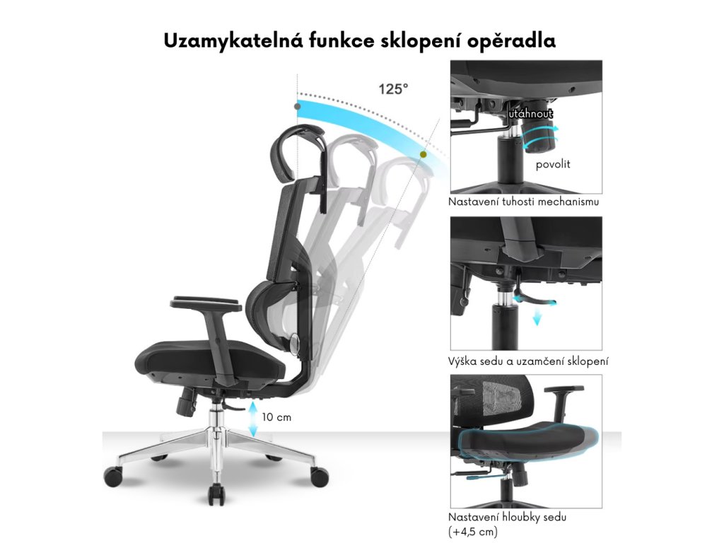 Opěrák a sedák se pohybují ve správném poměru, což podporuje zdravé sezení. Náklon až 125° lze zaaretovat ve více polohách a upravit tuhost podle hmotnosti uživatele.