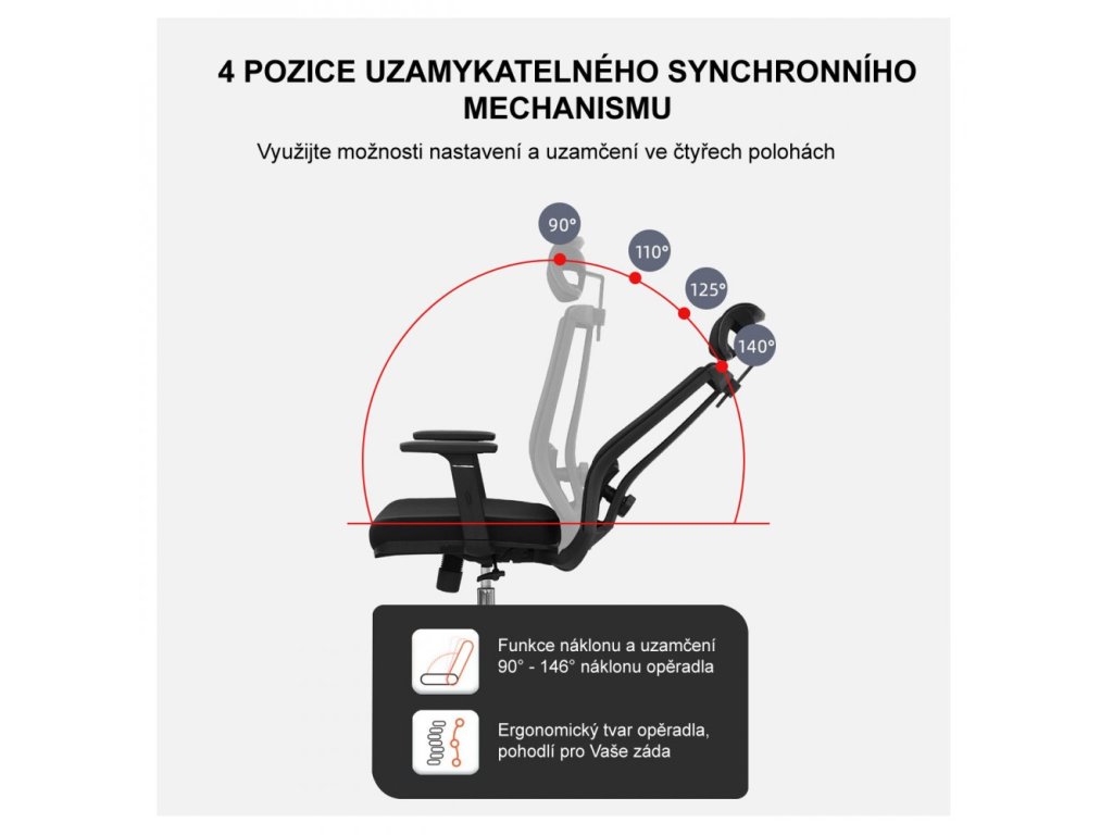 Synchronní mechanismus s možností aretace ve čtyřech polohách zajišťuje plynulý pohyb opěrky v úhlu až 135°, čímž podporuje aktivní sezení a zdravé držení těla. Zádová opěrka i bederní část se přizpůsobí přirozenému tvaru páteře a poskytují vynikající ergonomickou oporu. Komfortní polstrovaný sedák s hustou pěnou a prodyšné čalounění s odolností 100 000 cyklů zajistí dlouhodobé pohodlí i při osmihodinovém sezení.