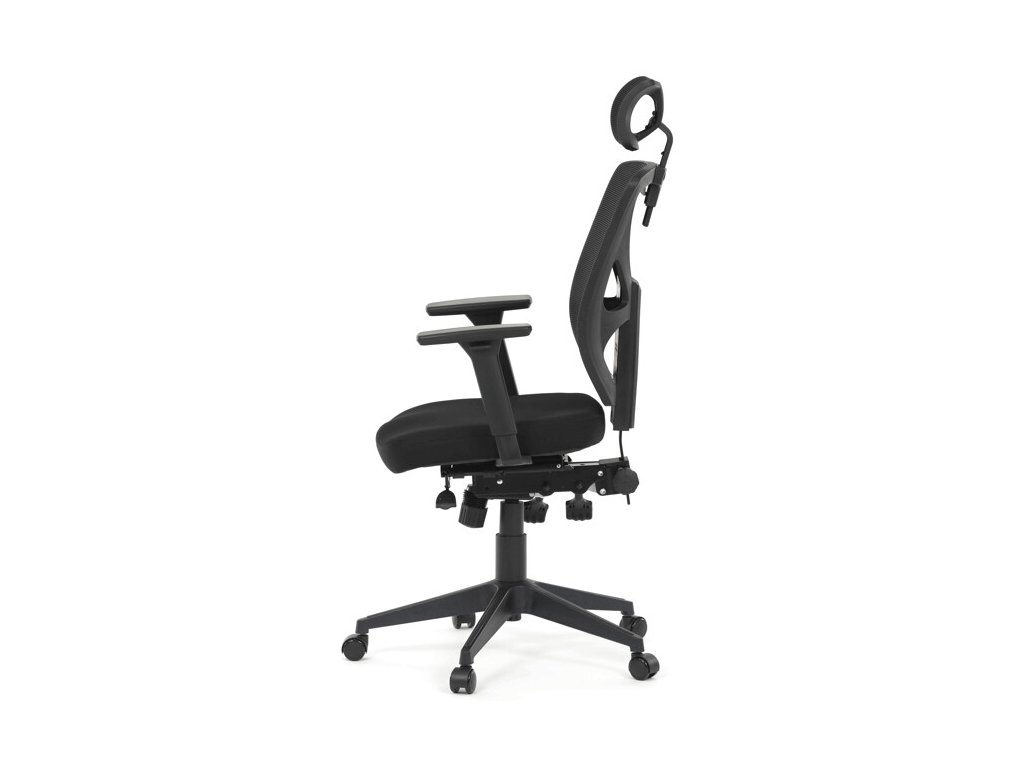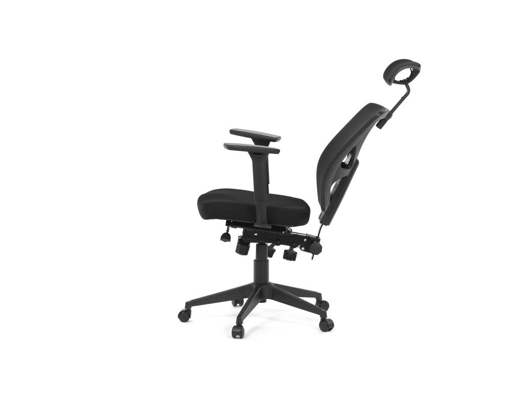 Velkou výhodou je posuv sedáku, díky kterému si jednoduše nastavíte optimální hloubku sezení. Synchronní mechanismus umožňuje plynulé naklápění opěradla včetně aretace v několika pozicích, což podporuje zdravé dynamické sezení během dne. Ergonomicky tvarované opěradlo je doplněno integrovanou opěrkou hlavy, jež pomáhá udržet správnou polohu krční páteře.