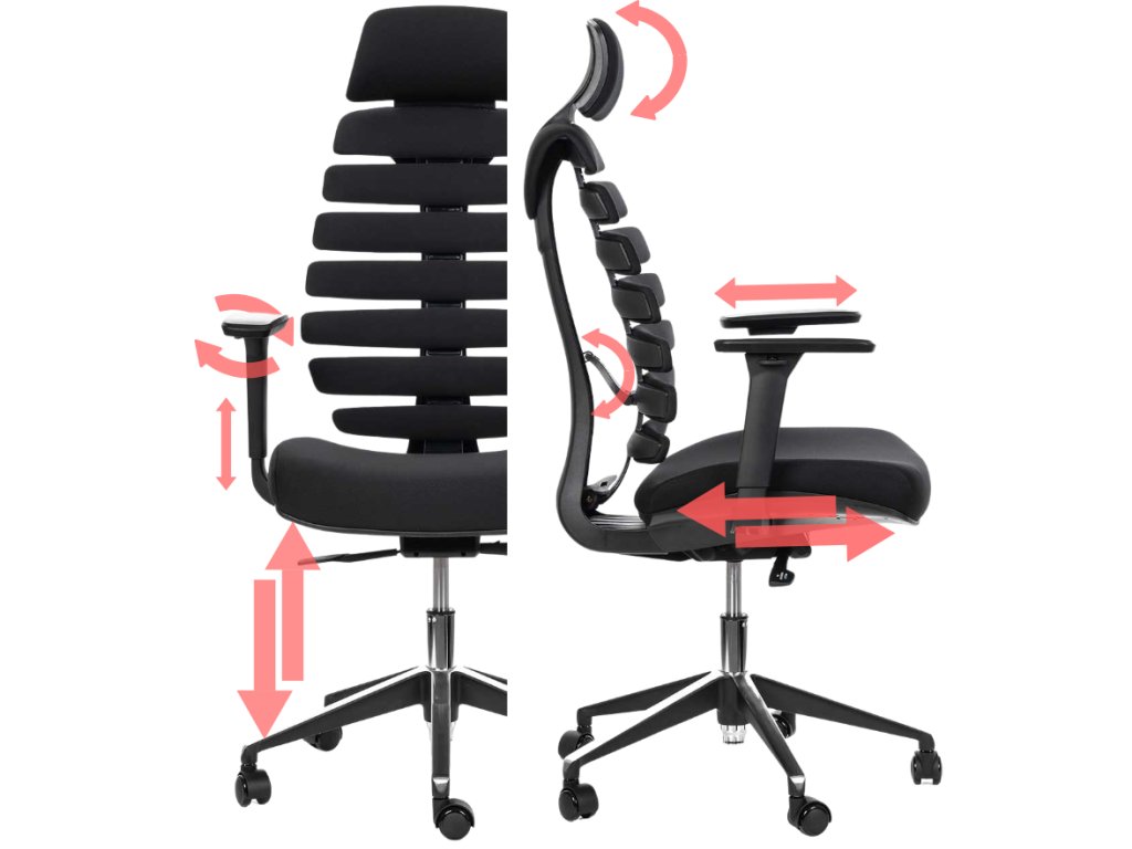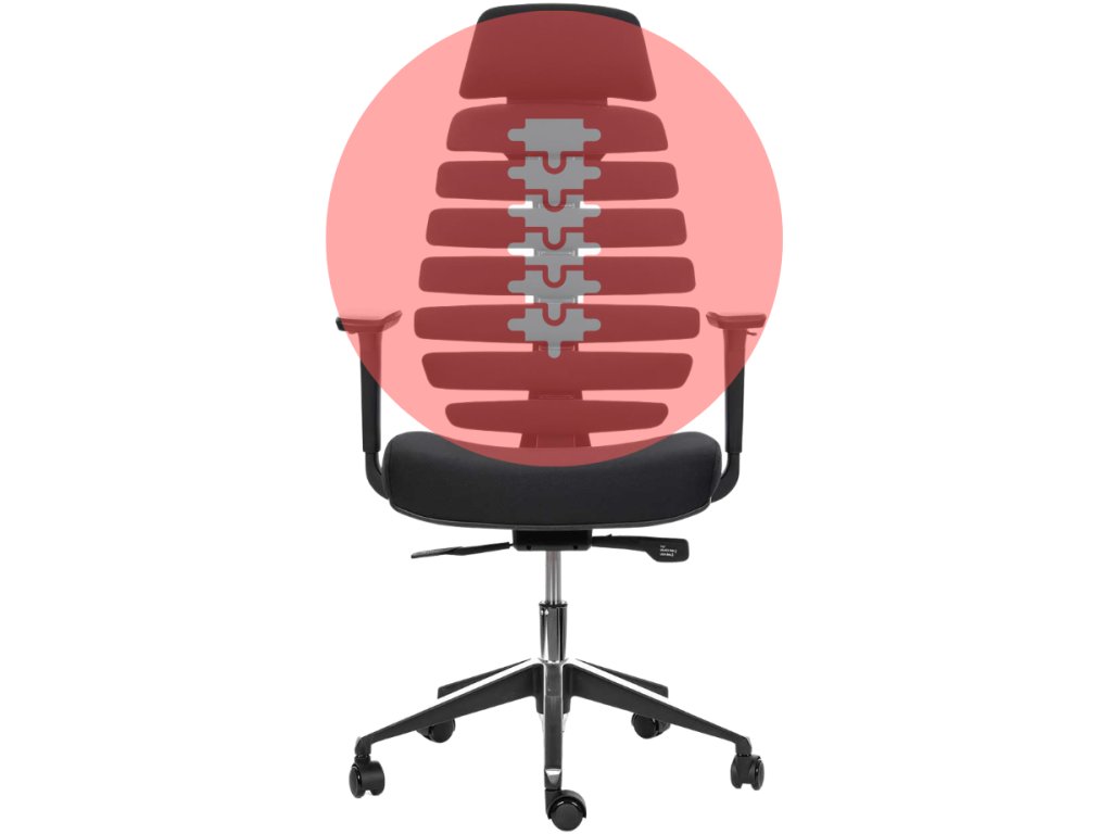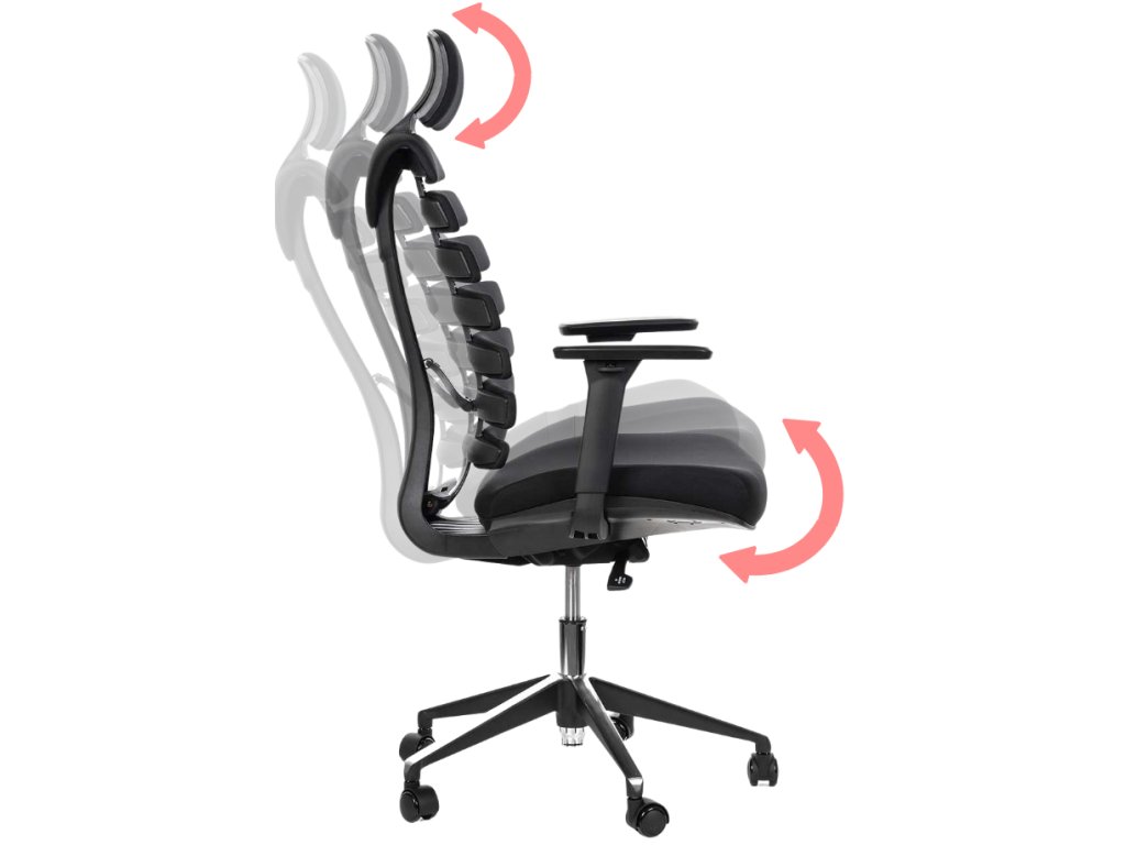 - Opěradlo: anatomicky tvarované, pružné lamely, nastavitelný bederní přítlak