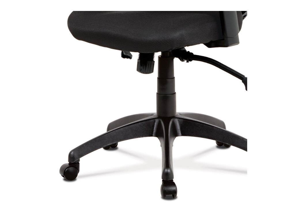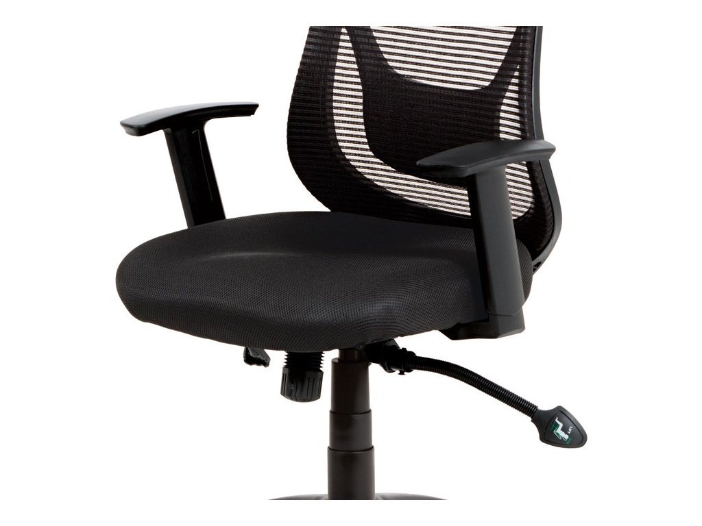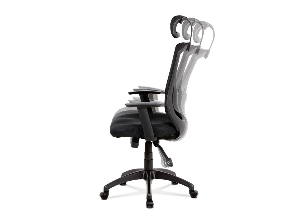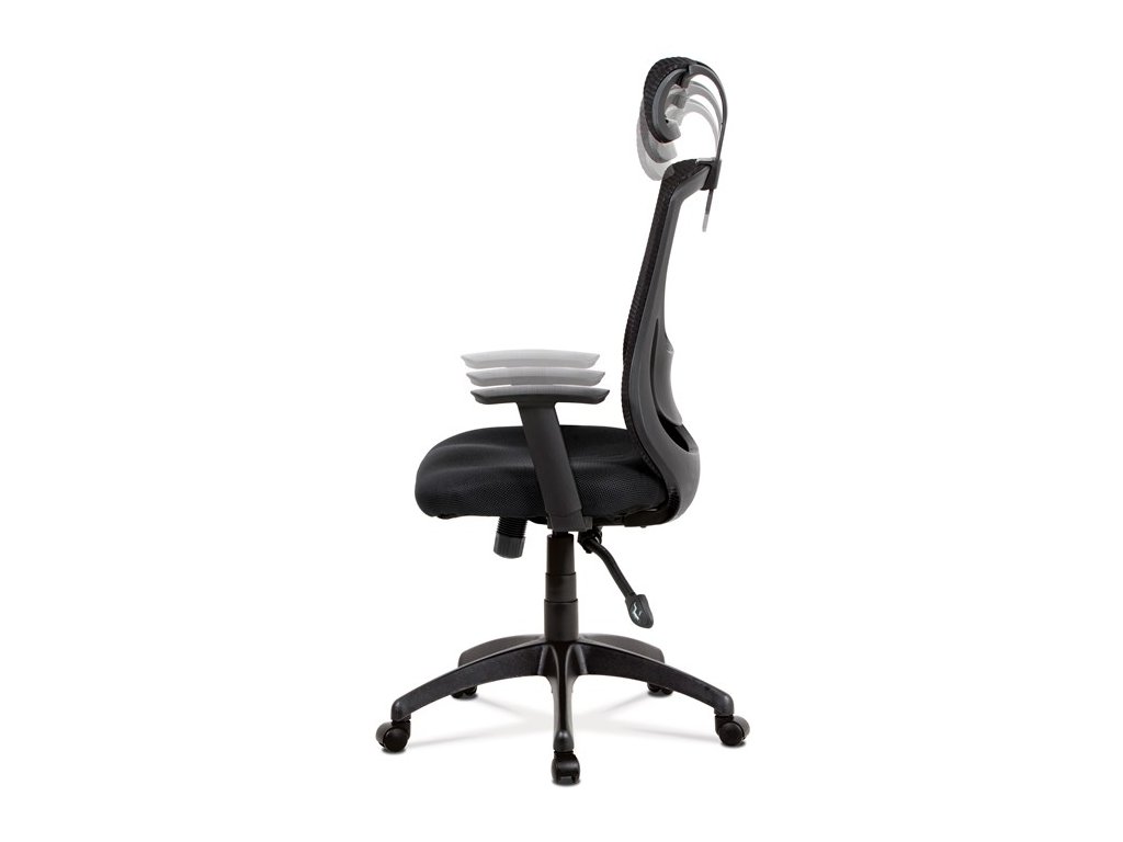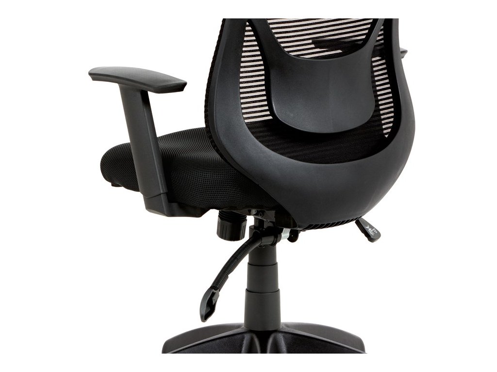 Opěradlo z prodyšné černé síťoviny zajišťuje optimální cirkulaci vzduchu, zatímco nastavitelná opěrka hlavy poskytuje potřebnou podporu krční páteře. O správné držení těla se stará také pevná bederní opěrka. Černý látkový sedák je pohodlný a odolný, doplněný o výškově nastavitelné područky s plastovou konstrukcí.