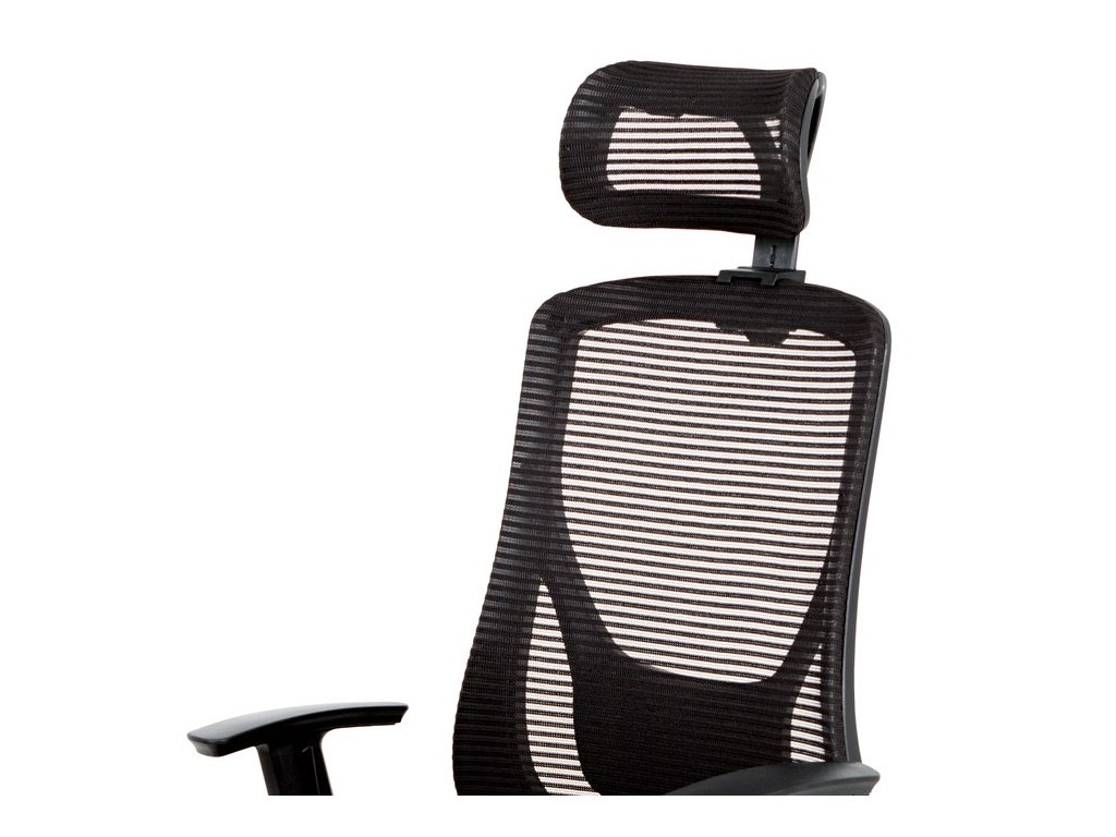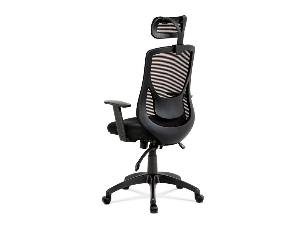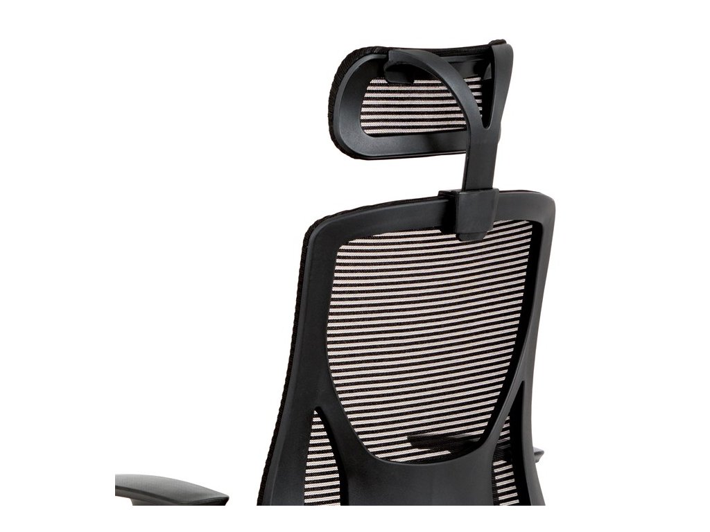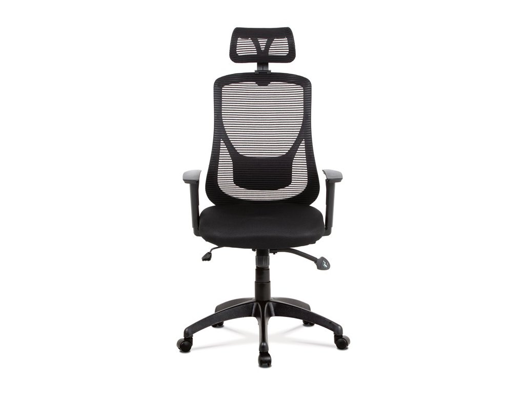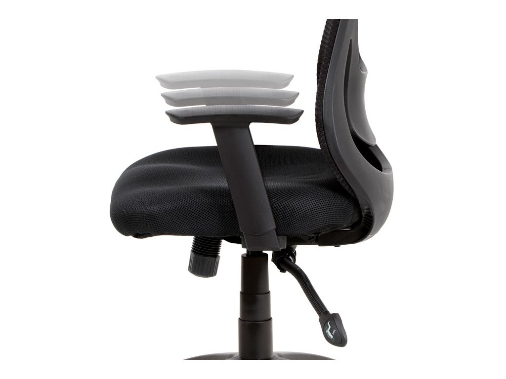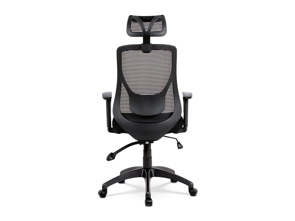 Opěradlo z prodyšné černé síťoviny zajišťuje optimální cirkulaci vzduchu, zatímco nastavitelná opěrka hlavy poskytuje potřebnou podporu krční páteře. O správné držení těla se stará také pevná bederní opěrka. Černý látkový sedák je pohodlný a odolný, doplněný o výškově nastavitelné područky s plastovou konstrukcí.