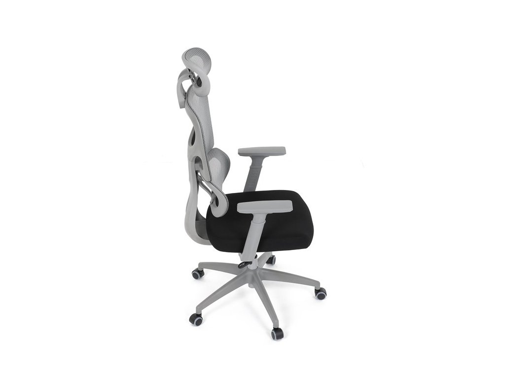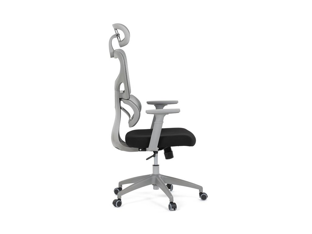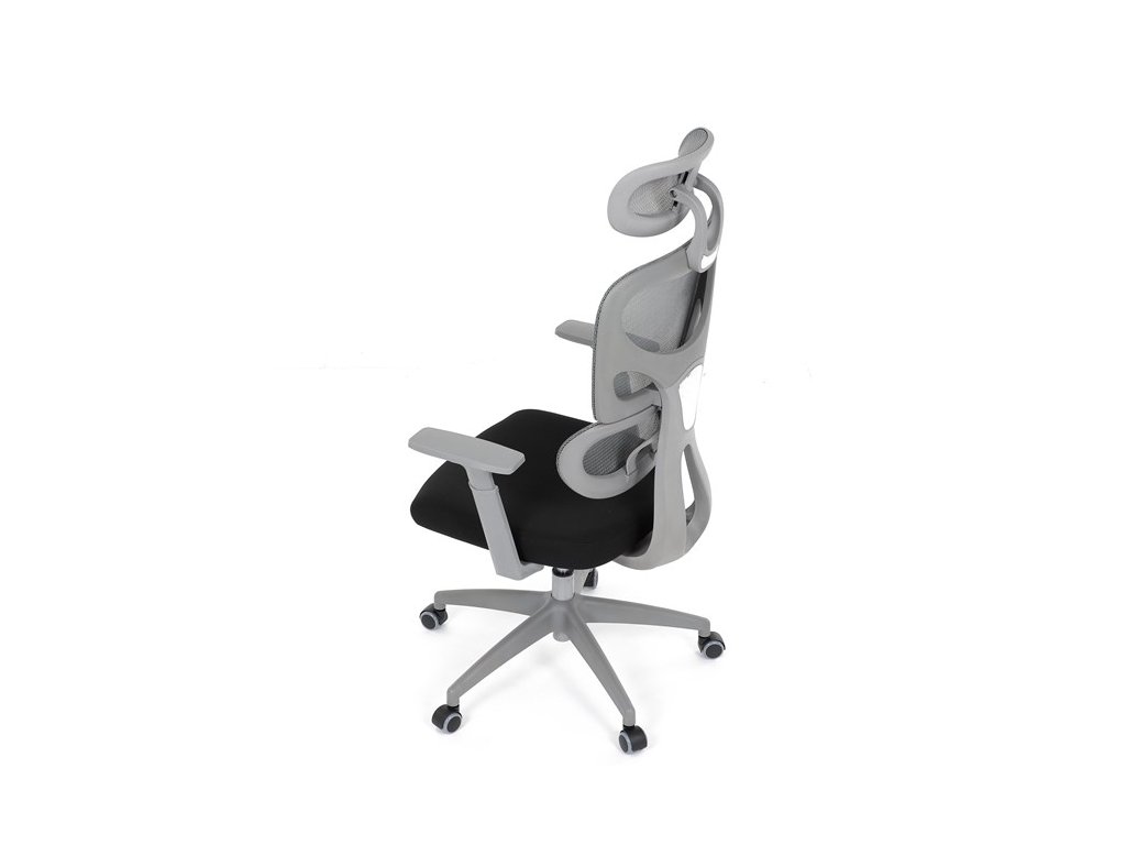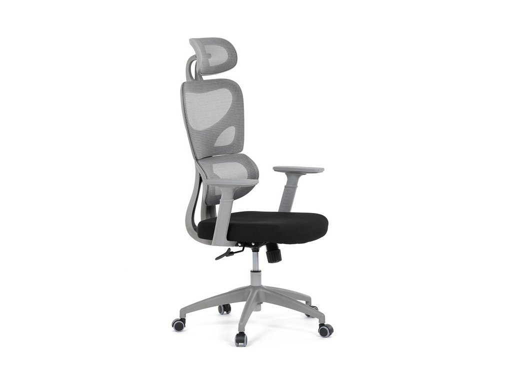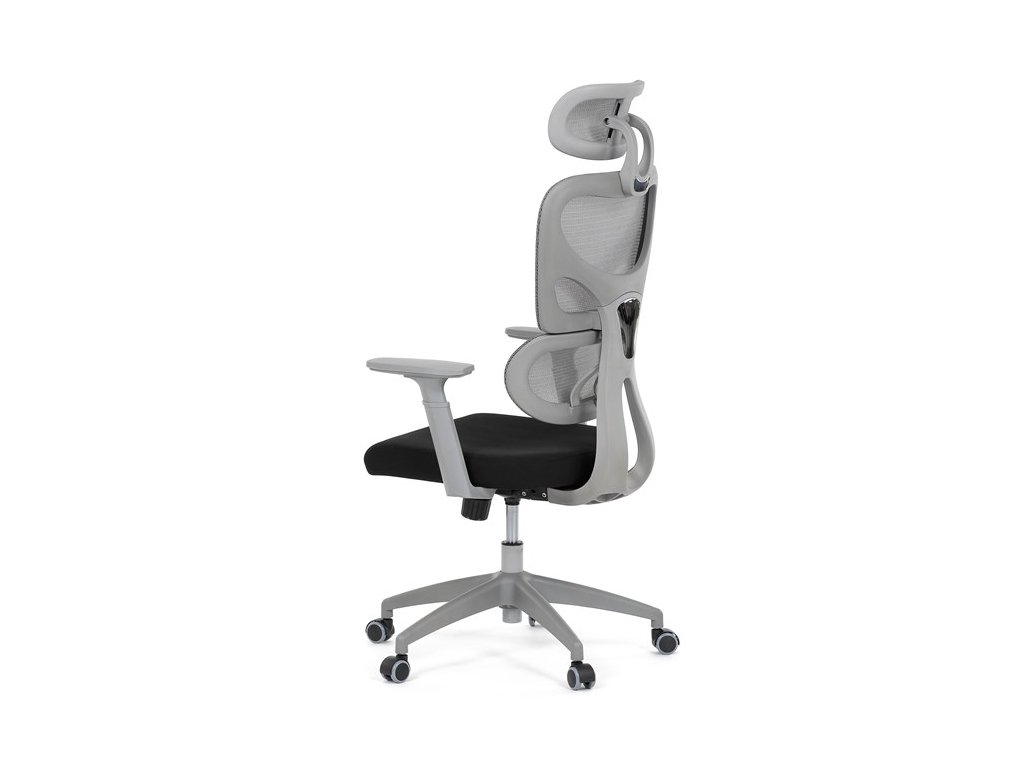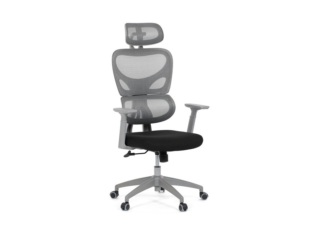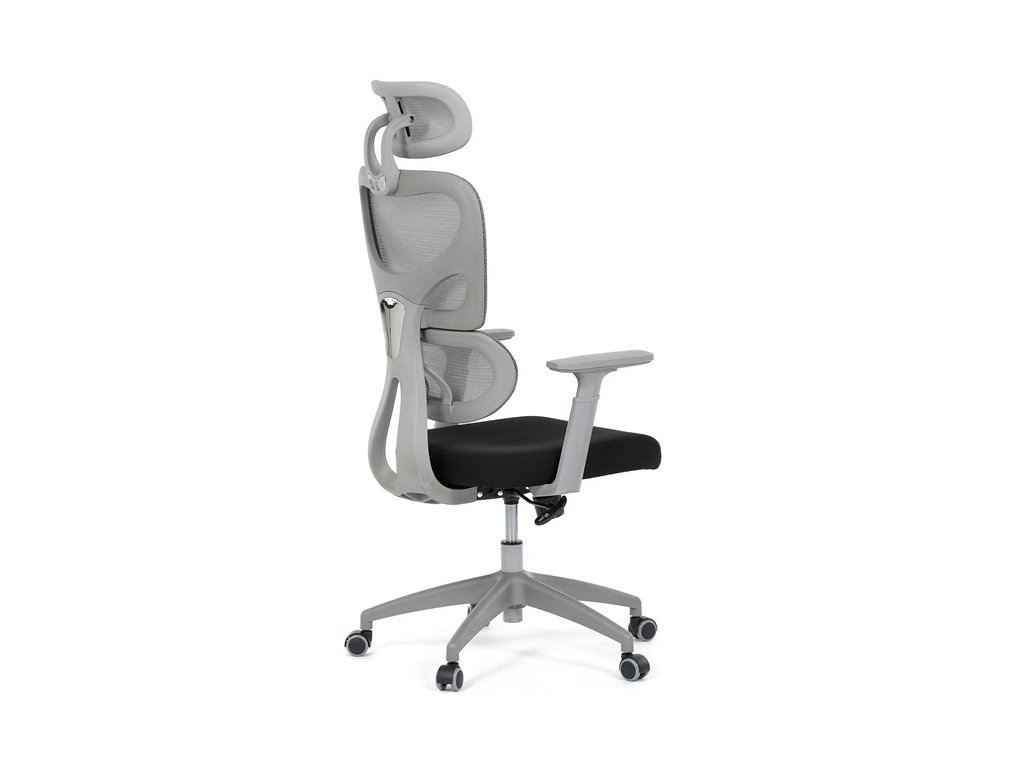 Opěradlo je potažené šedou prodyšnou síťovinou, která zajišťuje cirkulaci vzduchu a příjemné klima i během horkých dnů. Černý látkový sedák doplňuje moderní kontrastní design a díky kvalitnímu polstrování nabízí komfortní sezení i při celodenním používání. Minimalistický vzhled bez čalouněných područek podtrhuje lehkost a univerzálnost tohoto modelu, který se hodí do kanceláře i domácí pracovny.