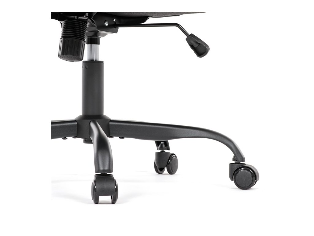Židle je vybavena houpacím mechanismem, který podporuje přirozený pohyb těla a uvolňuje páteř během práce. Pevné područky poskytují potřebnou oporu pro paže a přispívají k celkovému komfortu. Černý kovový kříž s kolečky vhodnými na tvrdé podlahy zajišťuje stabilitu, bezpečnost a snadnou mobilitu.