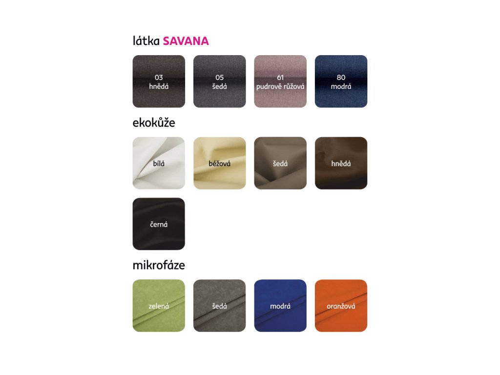 Možnost objednání ve vyobrazených barevných provedeních látek: Savana, Kronos, Soro, Lava v cene 3.290 Kč, v látce Coral Boucle v ceně 3.290 Kč, v mikrofázi za cenu 2.890 Kč, v ekokůži a v kombinaci ekokůže+látka Lava za cenu 3.390 Kč. Při individuální objednávce je třeba zaplatit 20% zálohu z dané částky. Po uhrazení zálohy bude Vaša objednávka zadána do výroby. Dodací lhůta 6-8 týdnů.