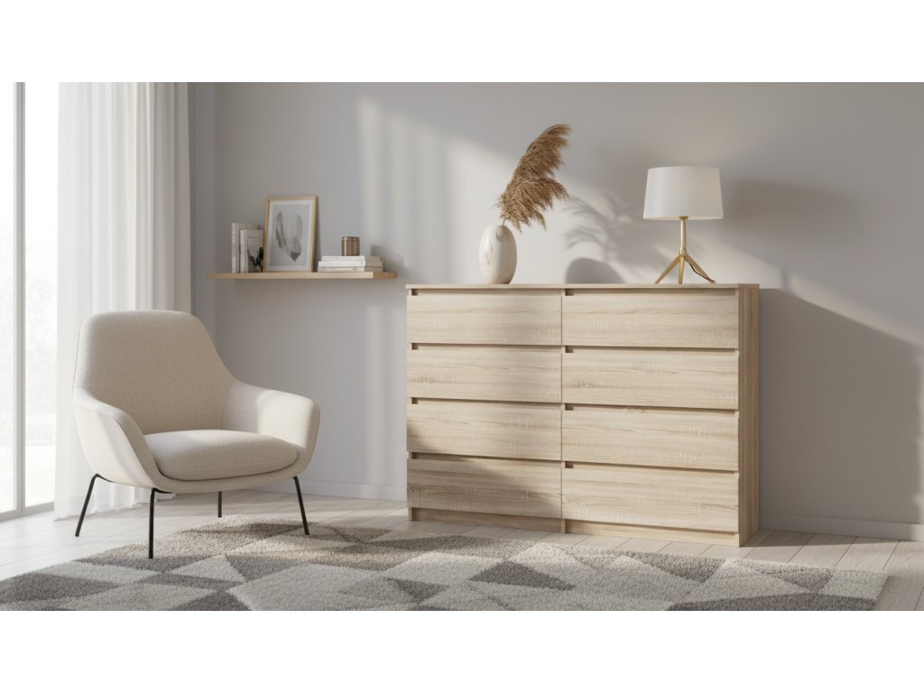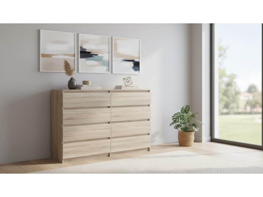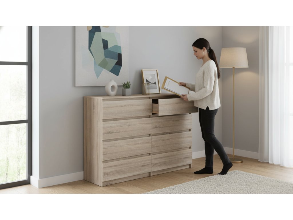 Moderní komoda VARIO v nadčasovém designu se skvěle hodí do různých typů interiérů. Dekor dub sonoma přináší do prostoru přírodní vzhled a příjemnou atmosféru.Díky své šířce nabízí dostatek úložného prostoru pro oblečení, dokumenty i domácí doplňky. Bezúchytkové provedení zásuvek zajišťuje čistý vzhled a pohodlné každodenní používání.