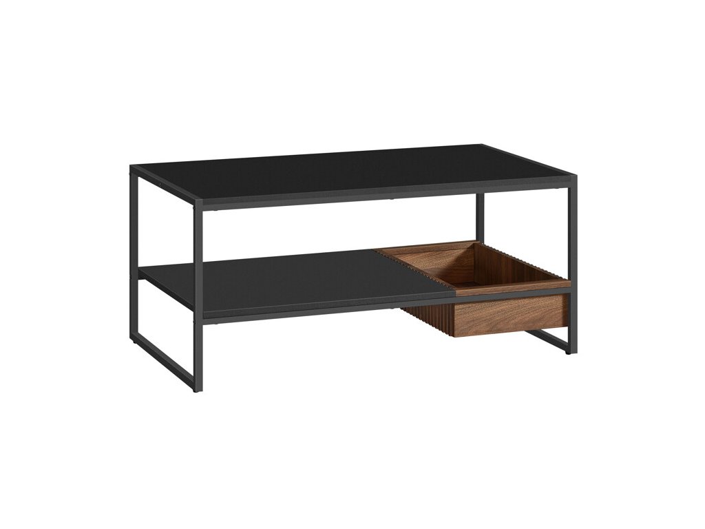 Konferenční stolek GOAL přináší kombinaci moderního designu, kvalitního zpracování a promyšlené funkčnosti, která se stane okamžitě viditelným prvkem vašeho obývacího pokoje. Jeho pevná kovová konstrukce zajišťuje vysokou stabilitu a dlouhou životnost, zatímco horní deska z MDF v matném černém provedení s dekorem přírodního ořechu dodává stolku elegantní a luxusní vzhled. Díky svému promyšlenému uspořádání nabízí dostatek úložného prostoru – nechybí otevřená police pro odkládání časopisů či ovladačů a také praktická zásuvka s výraznou dřevěnou kresbou, která posiluje estetický kontrast a dodává stolku jedinečný charakter.