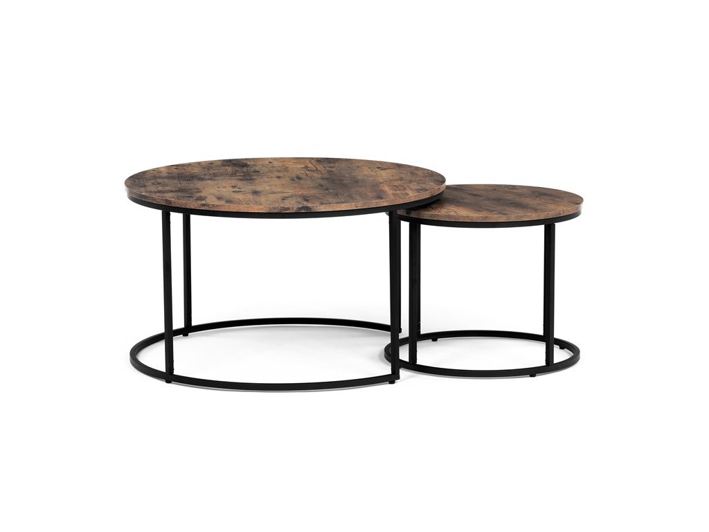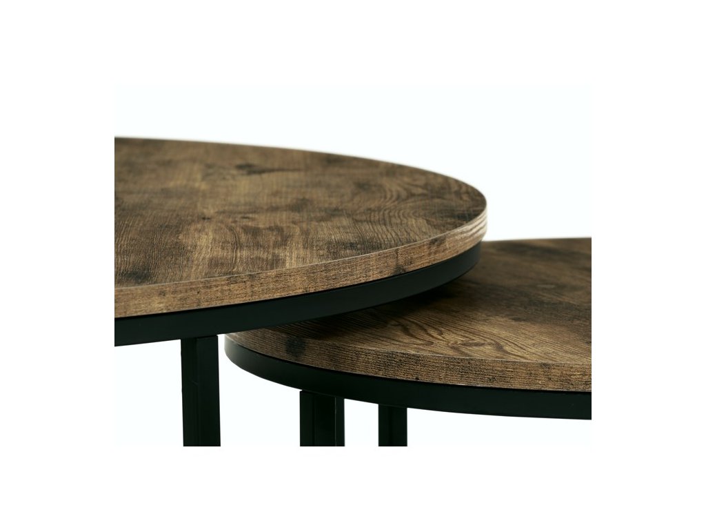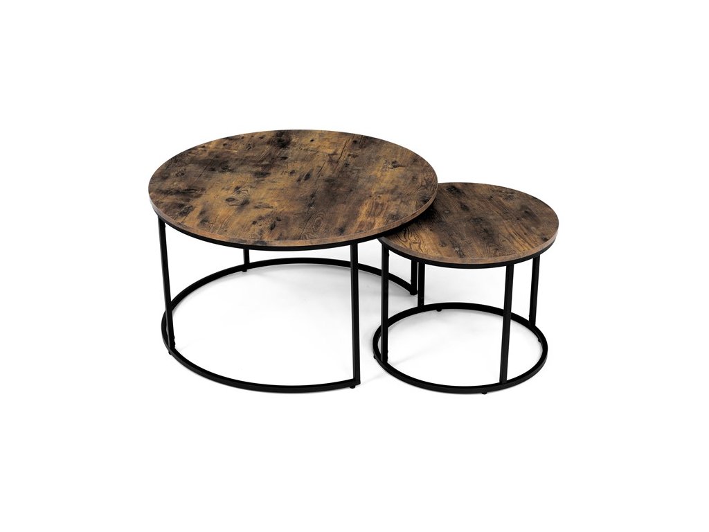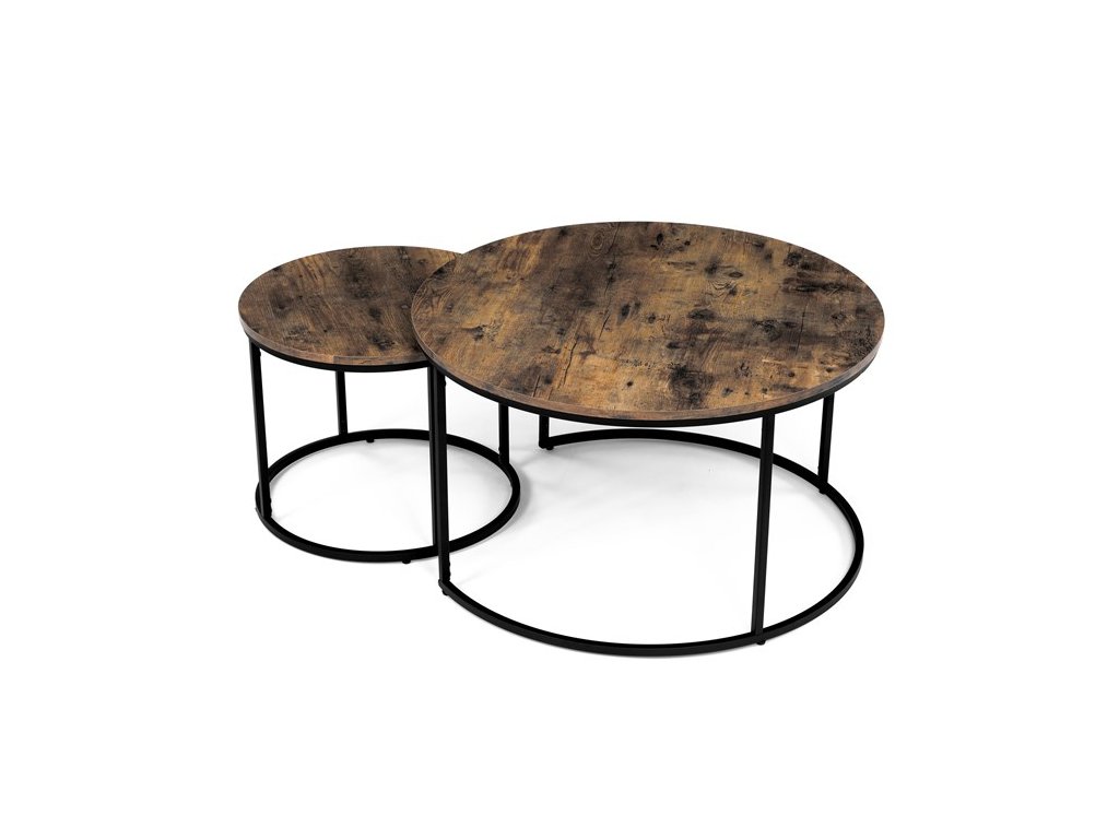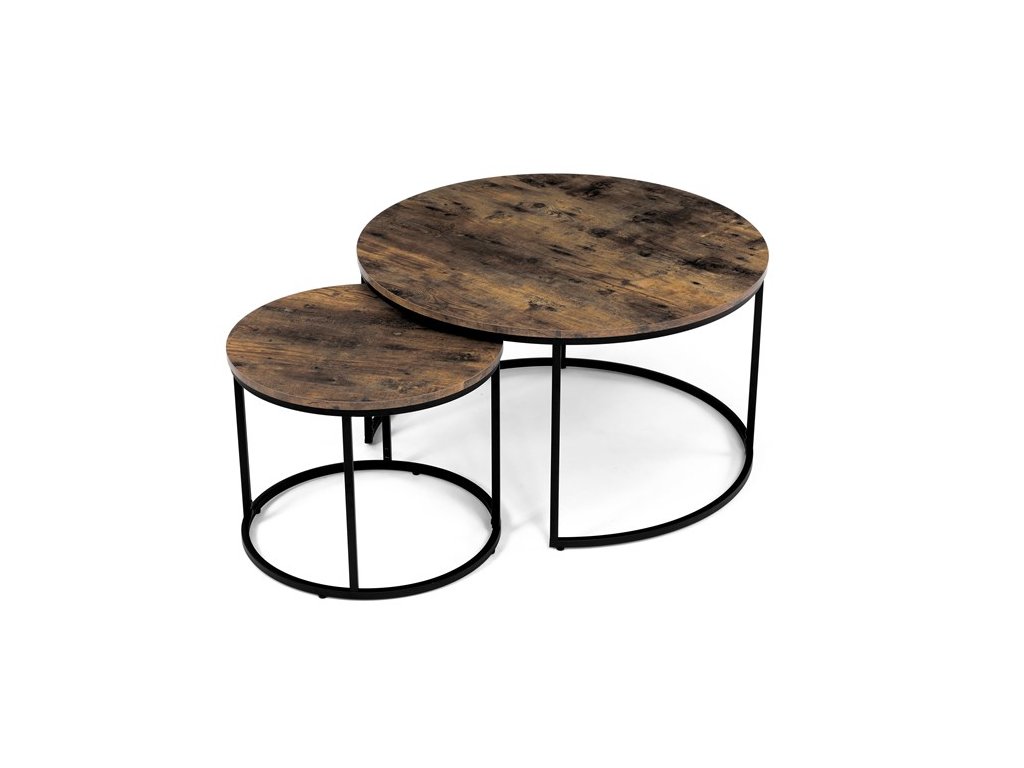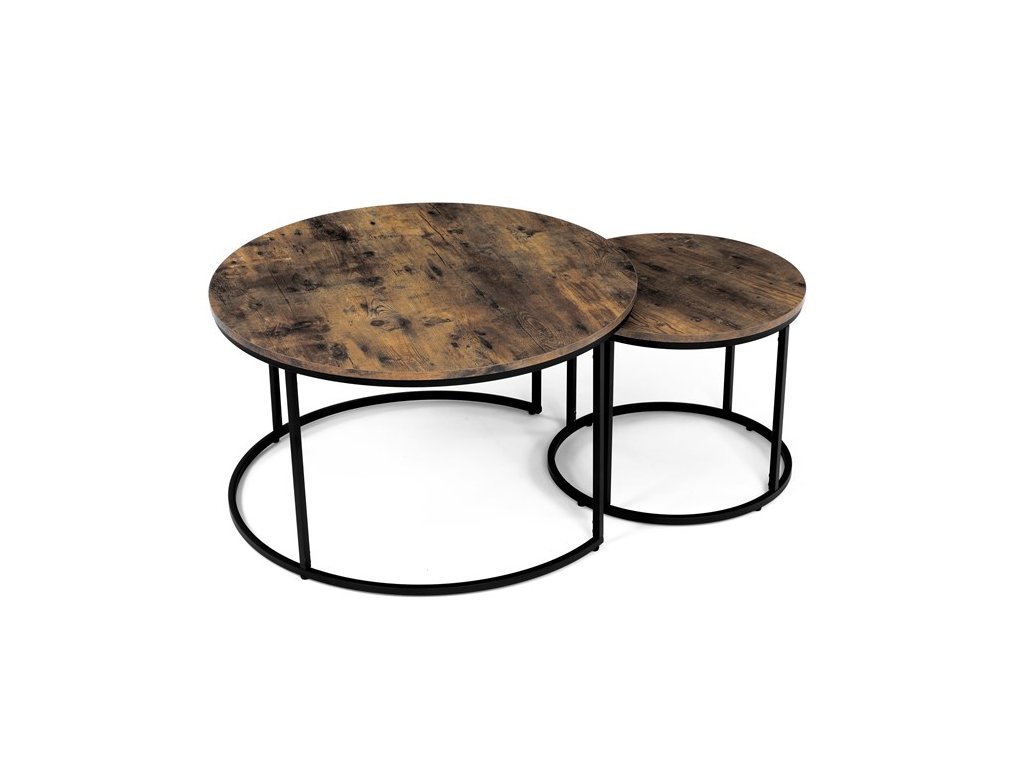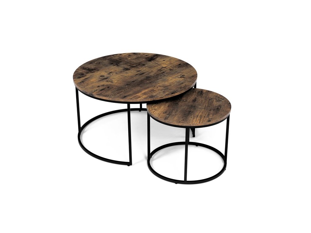Kulaté desky z MDF materiálu doplňuje pevná kovová konstrukce s černým matným práškovým nástřikem, která tvoří obvod i nohy stolků. Ta zajišťuje vysokou stabilitu a odolnost, přičemž černé plastové kluzáky na spodní části chrání podlahu před poškozením. Robustní provedení s deskami o tloušťce 1,5 cm a průměrem 80 a 50 cm zaručuje dlouhou životnost. Stolky se hodí do moderních i industriálně laděných interiérů, kde nabídnou dostatek prostoru pro dekorace, nápoje i praktické využití.