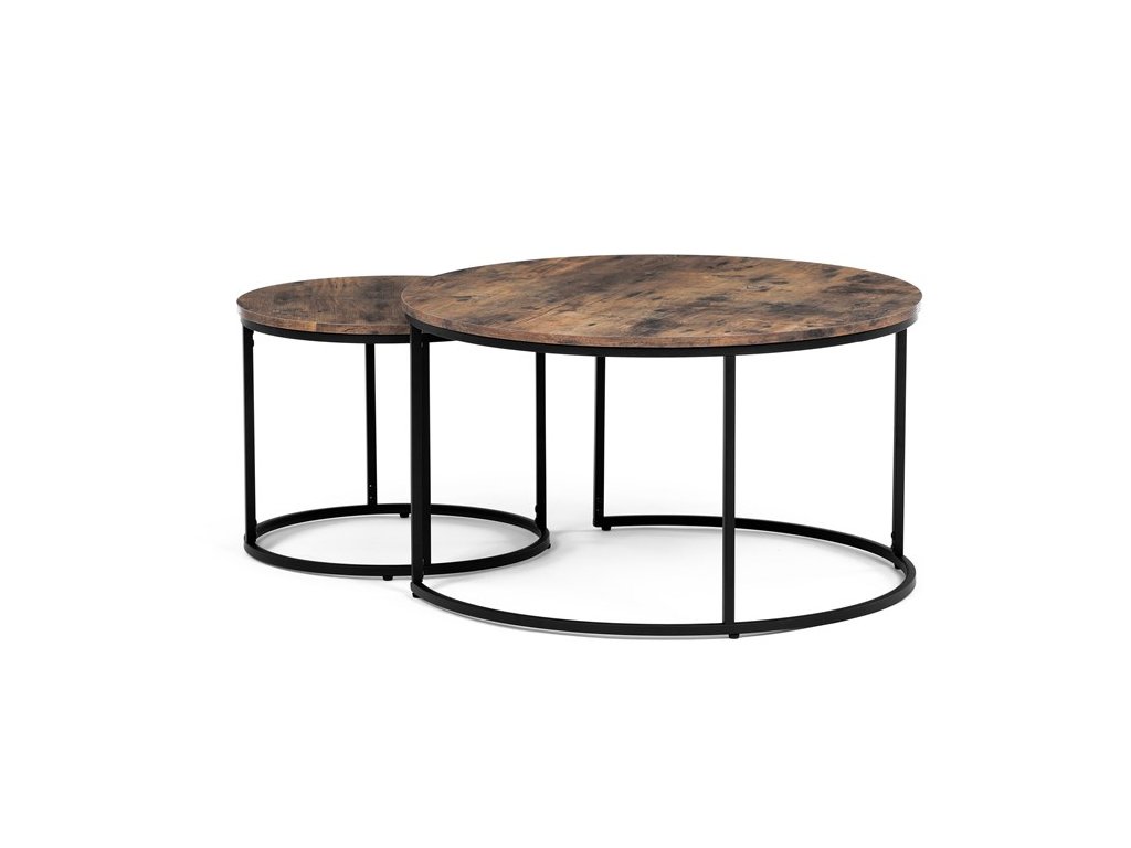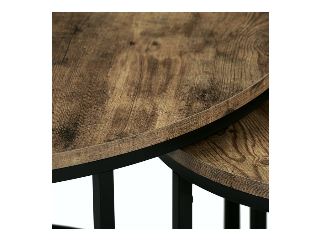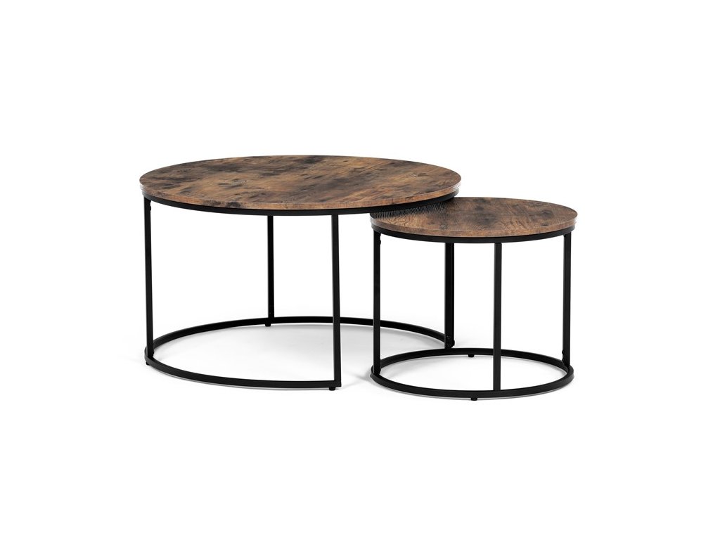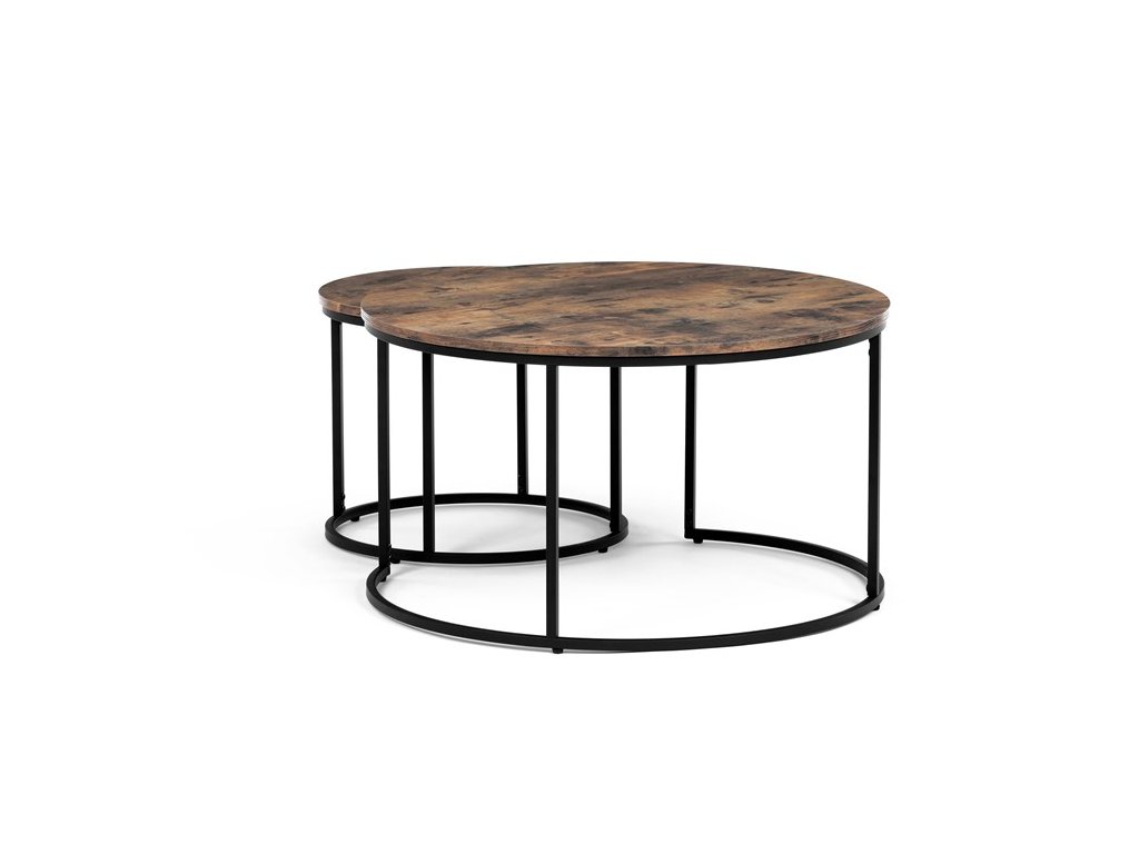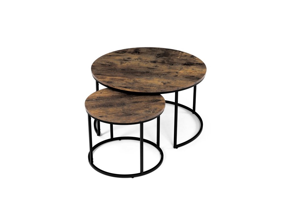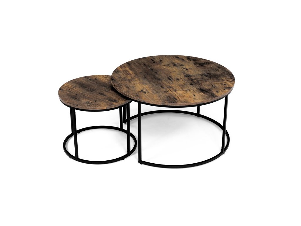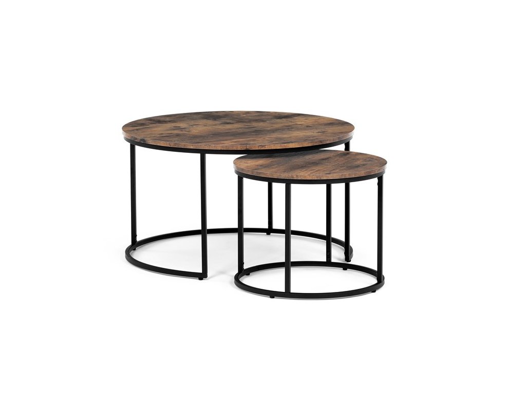 Kulaté desky z MDF materiálu doplňuje pevná kovová konstrukce s černým matným práškovým nástřikem, která tvoří obvod i nohy stolků. Ta zajišťuje vysokou stabilitu a odolnost, přičemž černé plastové kluzáky na spodní části chrání podlahu před poškozením. Robustní provedení s deskami o tloušťce 1,5 cm a průměrem 80 a 50 cm zaručuje dlouhou životnost. Stolky se hodí do moderních i industriálně laděných interiérů, kde nabídnou dostatek prostoru pro dekorace, nápoje i praktické využití.
