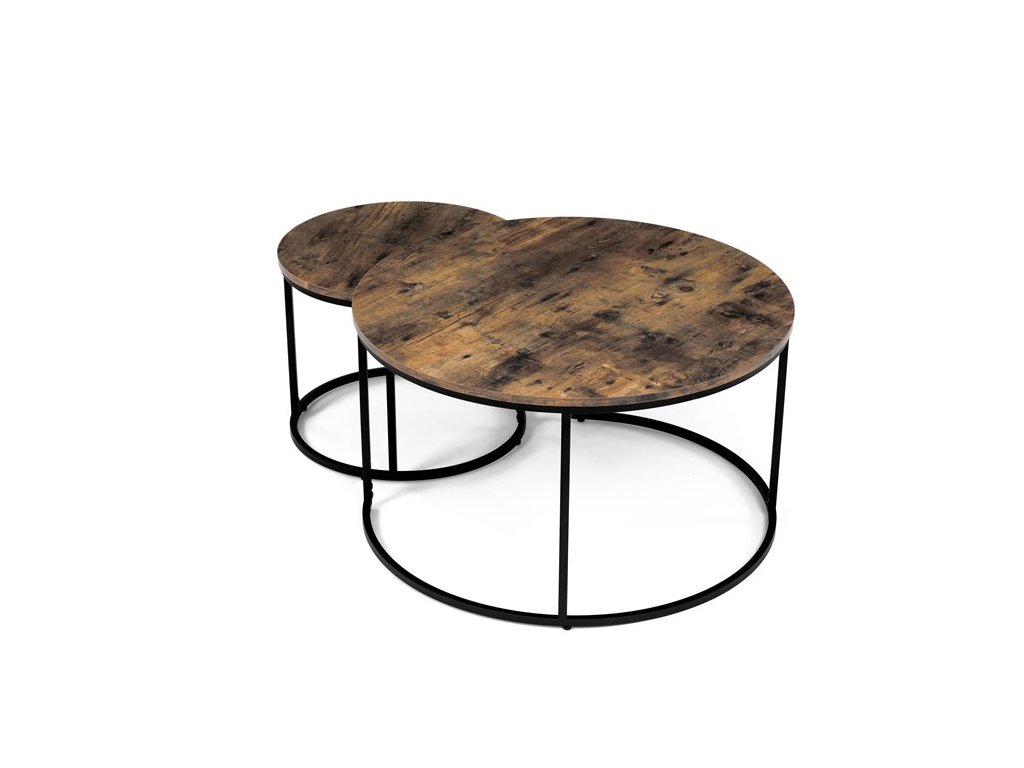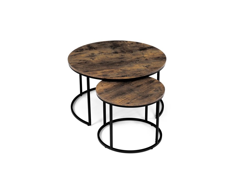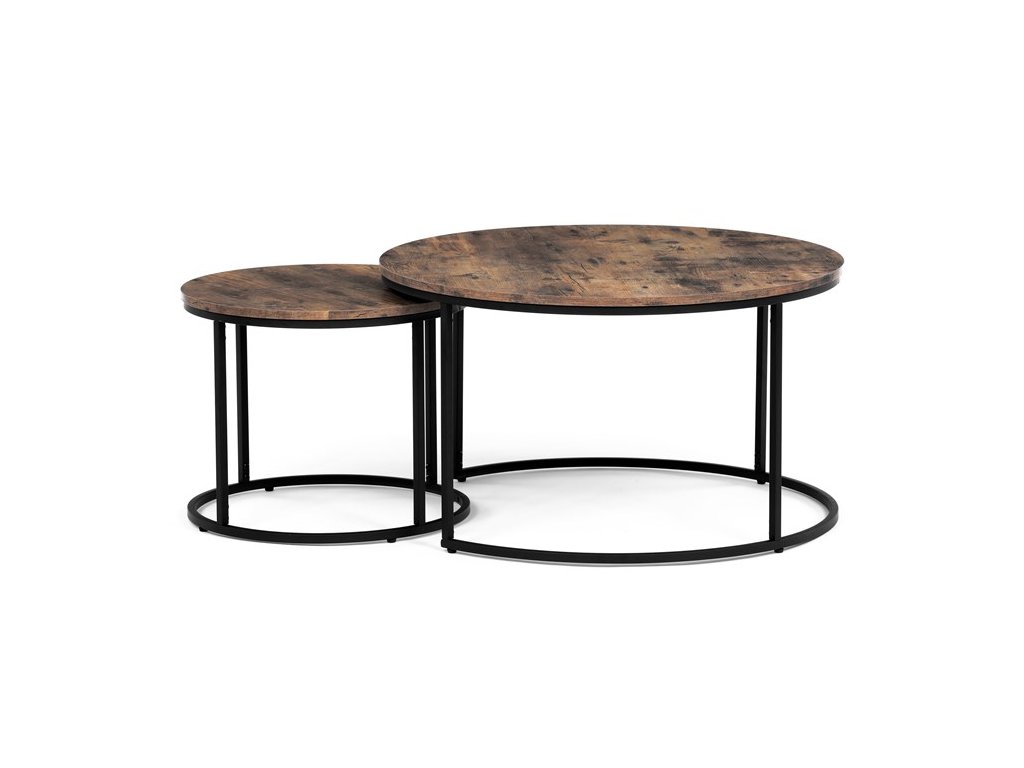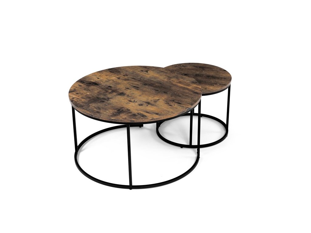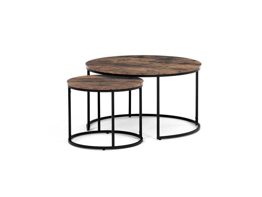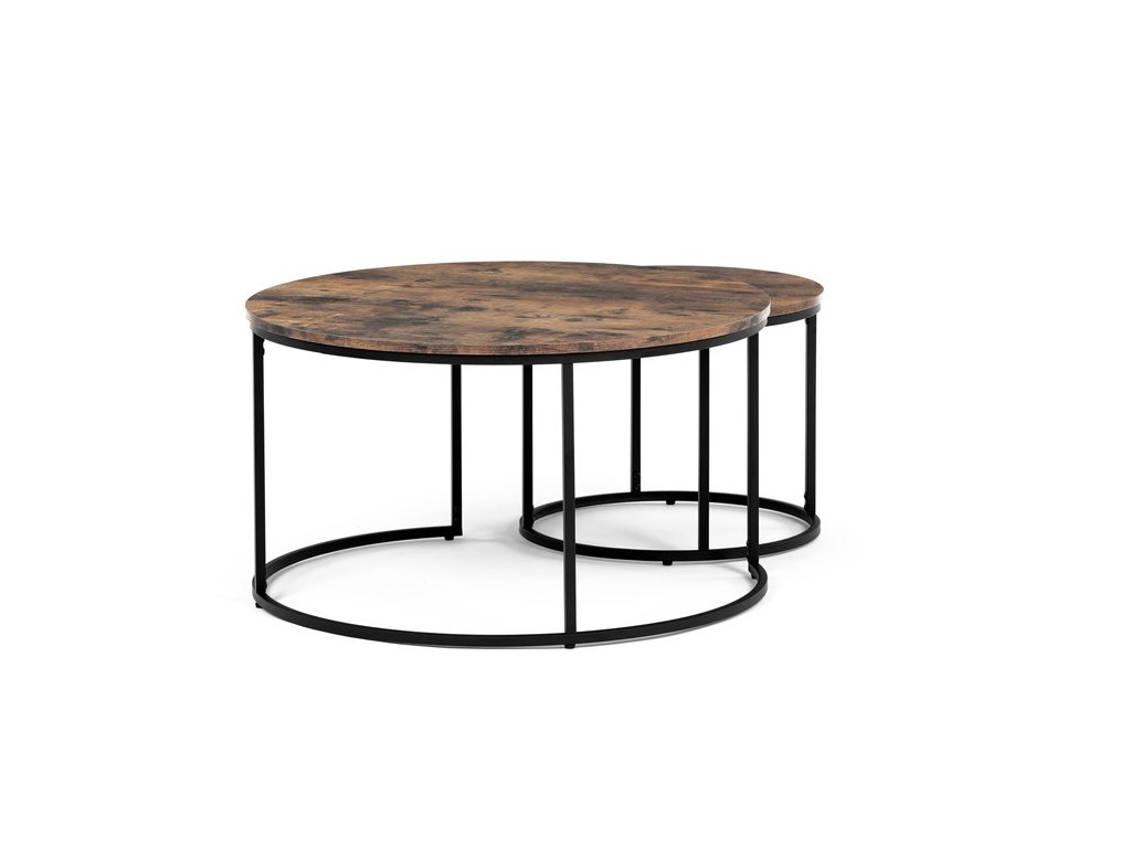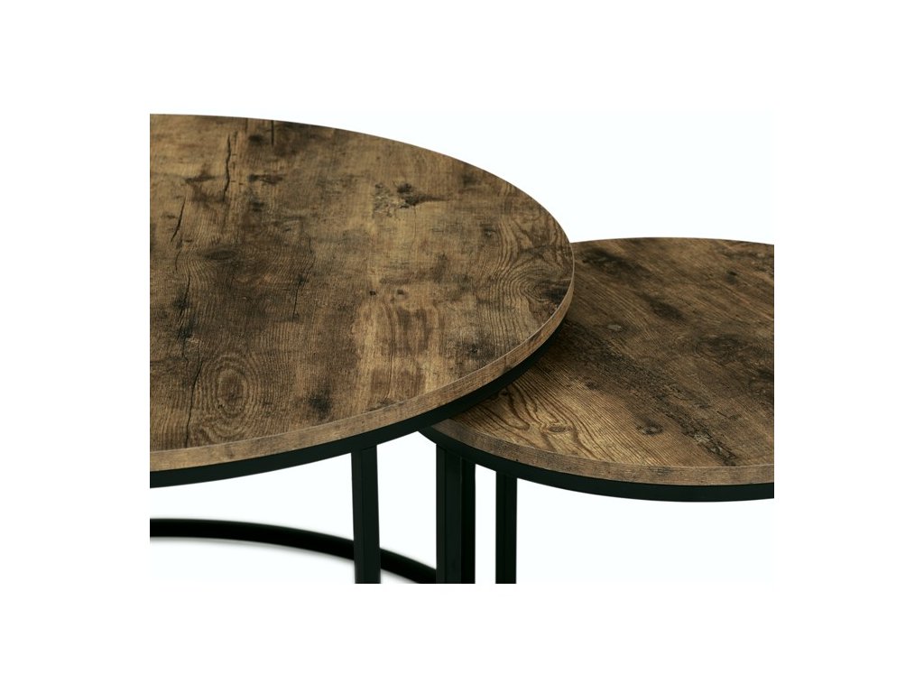 Kulaté desky z MDF materiálu doplňuje pevná kovová konstrukce s černým matným práškovým nástřikem, která tvoří obvod i nohy stolků. Ta zajišťuje vysokou stabilitu a odolnost, přičemž černé plastové kluzáky na spodní části chrání podlahu před poškozením. Robustní provedení s deskami o tloušťce 1,5 cm a průměrem 80 a 50 cm zaručuje dlouhou životnost. Stolky se hodí do moderních i industriálně laděných interiérů, kde nabídnou dostatek prostoru pro dekorace, nápoje i praktické využití.