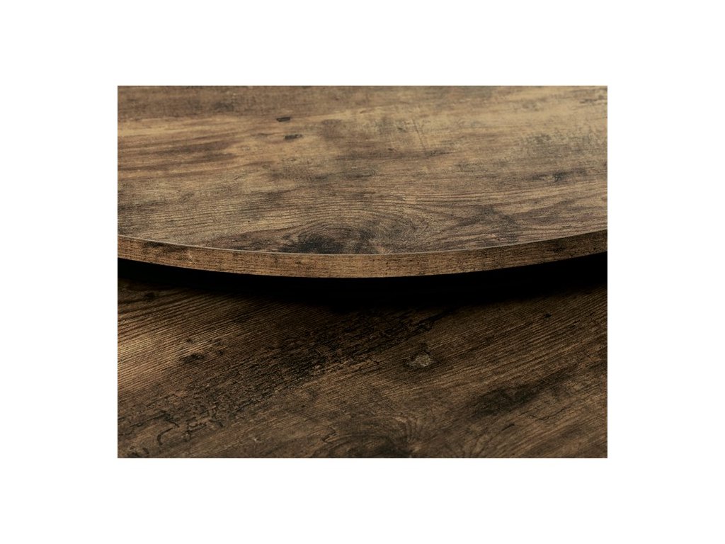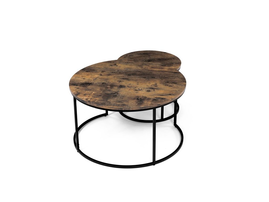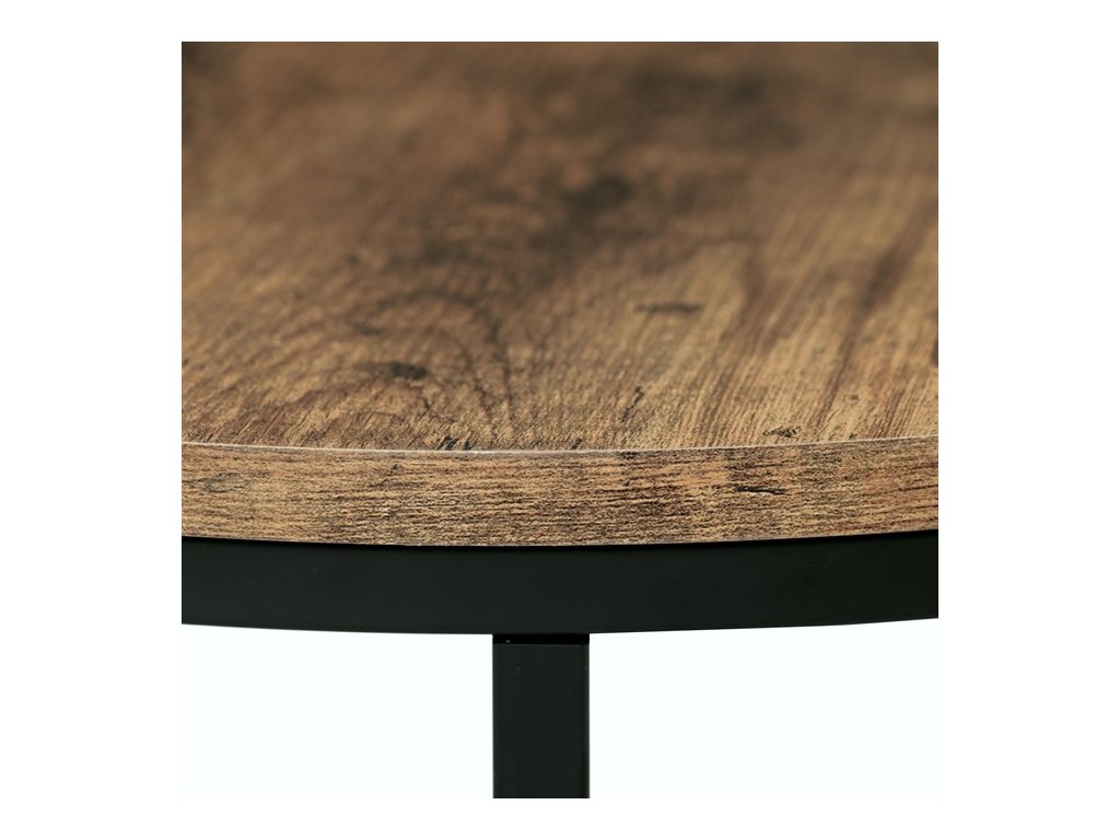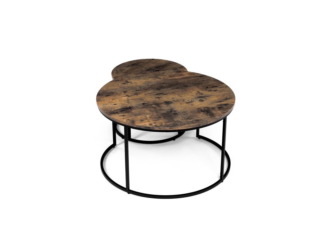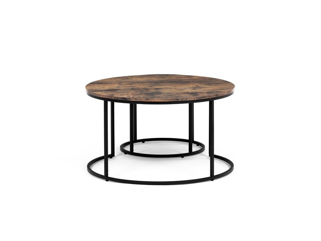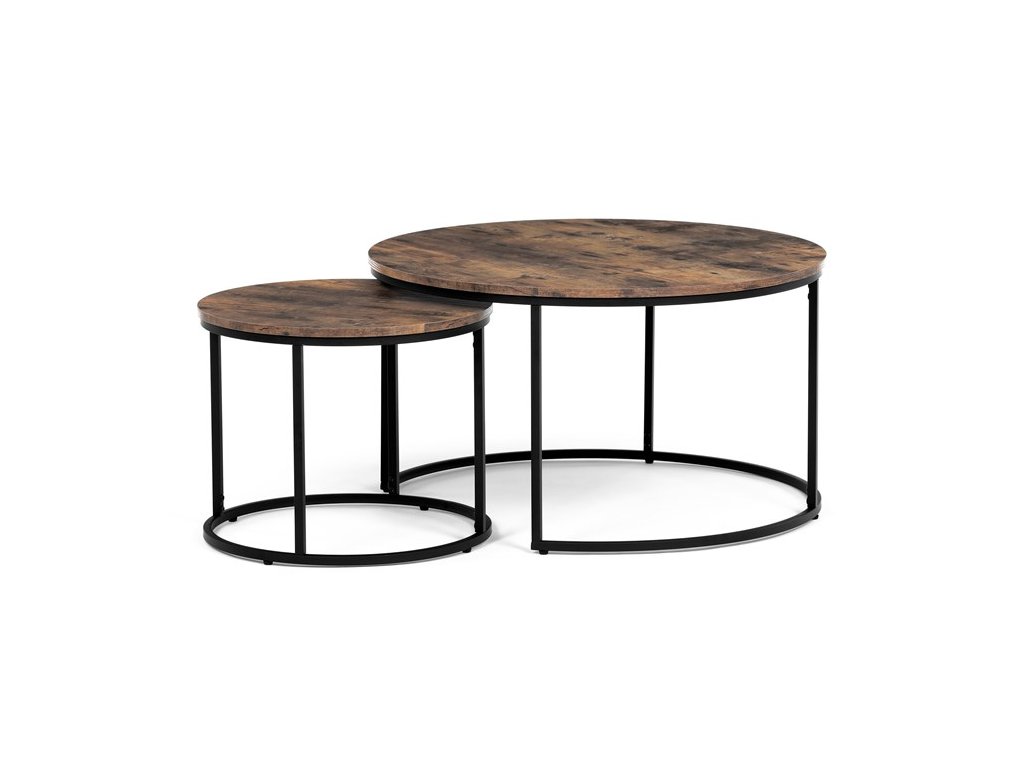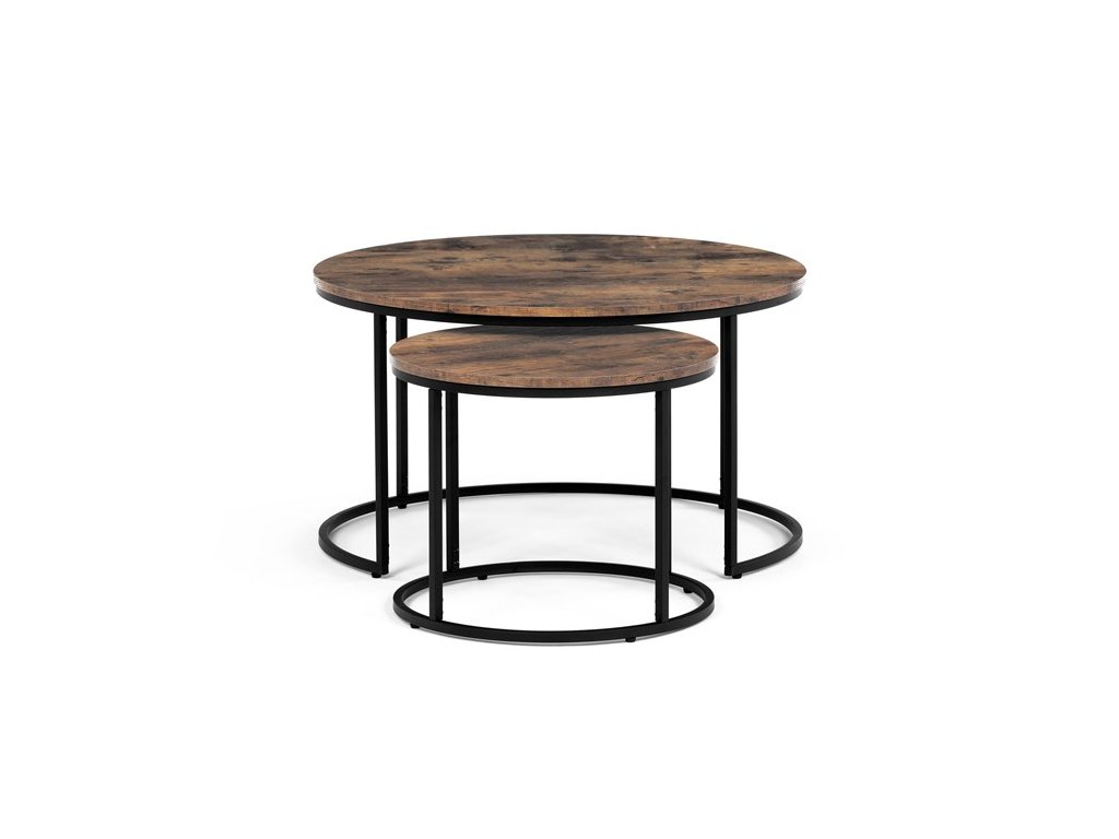 Kulaté desky z MDF materiálu doplňuje pevná kovová konstrukce s černým matným práškovým nástřikem, která tvoří obvod i nohy stolků. Ta zajišťuje vysokou stabilitu a odolnost, přičemž černé plastové kluzáky na spodní části chrání podlahu před poškozením. Robustní provedení s deskami o tloušťce 1,5 cm a průměrem 80 a 50 cm zaručuje dlouhou životnost. Stolky se hodí do moderních i industriálně laděných interiérů, kde nabídnou dostatek prostoru pro dekorace, nápoje i praktické využití.