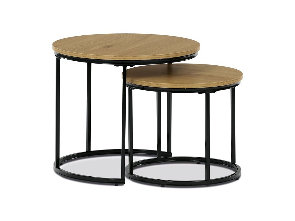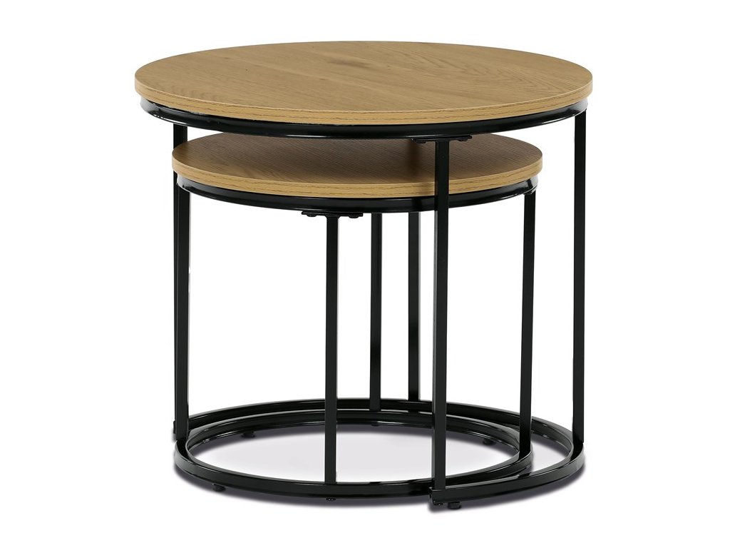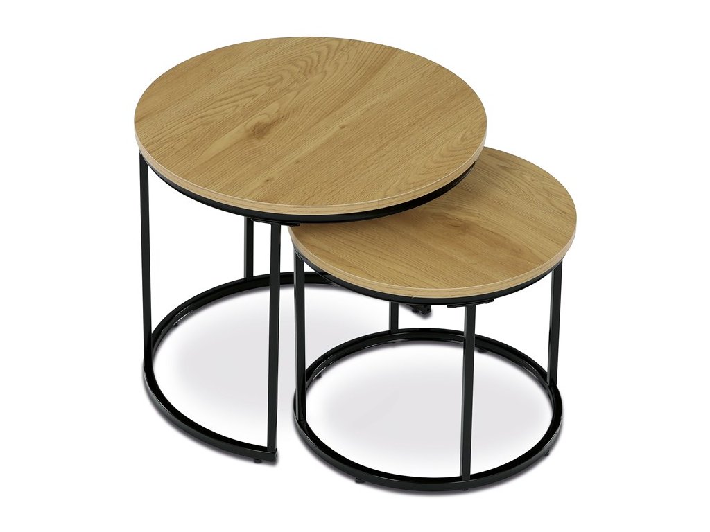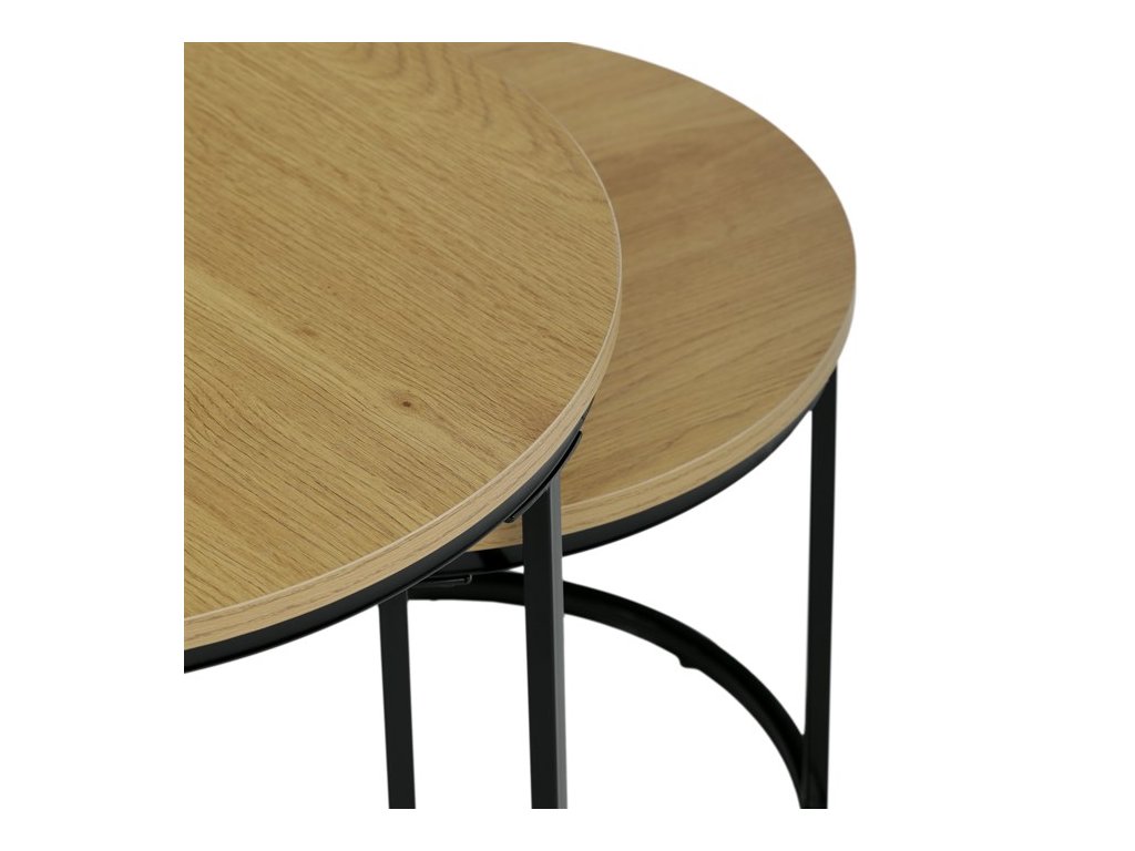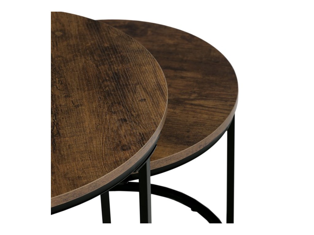 Sada odkládacích stolků VIKEN kombinuje moderní design s maximální praktičností. Kulaté desky doplněné o černé kovové nohy vytvářejí elegantní industriální vzhled, který snadno zapadne do různých interiérů. Díky chytrému řešení lze stoly zasunout pod sebe, což šetří místo a zároveň zvyšuje jejich funkčnost. Jsou perfektní volbou do obývacího pokoje pro odložení nápojů, knih či dekorací.