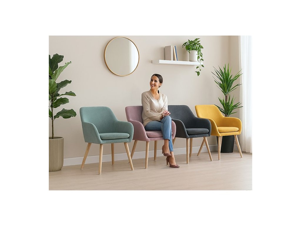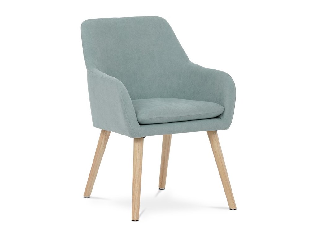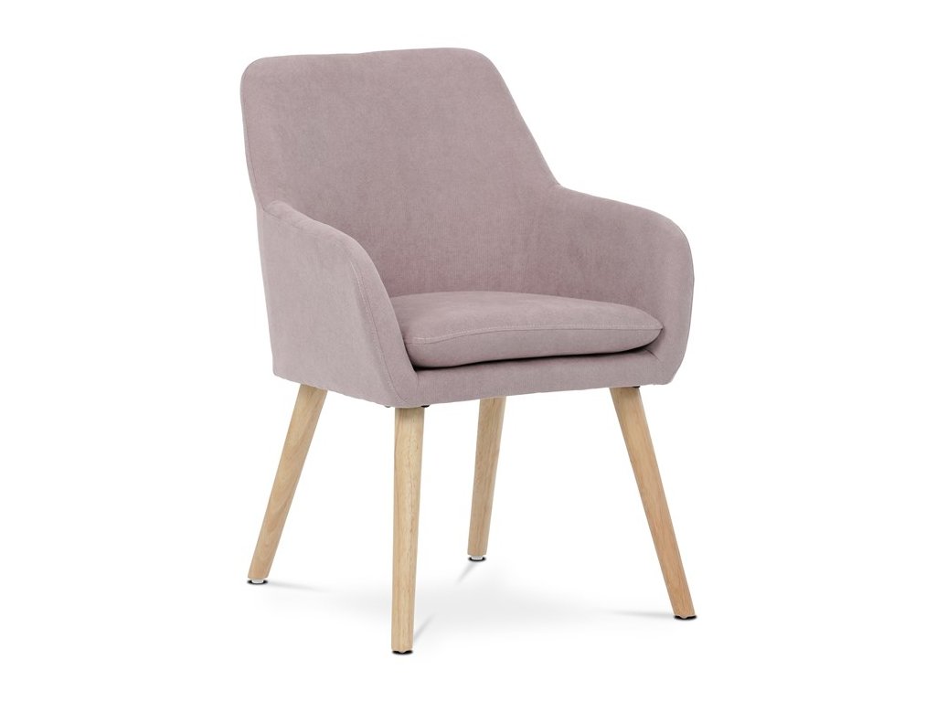 Křeslo doplňují pevné masivní nohy z kaučukovníkového dřeva v přírodní barvě, které vytvářejí kontrast s látkovým sedákem a zaručují stabilitu i dlouhou životnost. Robustní konstrukce poskytuje nosnost až 120 kg, takže židle spojuje estetiku s praktičností.