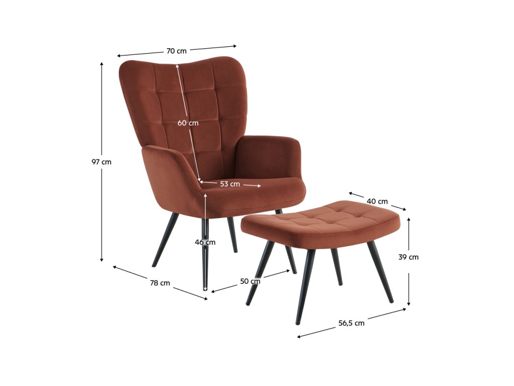 Křeslo ušák LUMEN vnese do vašeho domova nádech elegance i výjimečného komfortu. Je potaženo kvalitní sametovou látkou Velvet, která je příjemná na dotek, působí luxusně a zároveň vyniká vysokou odolností – v testu Martindale dosahuje hodnoty 95 000 cyklů. Pro dokonalý odpočinek je součástí setu také praktická podnožka, která vám poskytne úlevu pro unavené nohy. Oba kusy stojí na stabilní černé kovové konstrukci, díky níž je zajištěna pevnost, stabilita i dlouhá životnost. Dekorativní prošívání na opěradle i podnožce dodává celému setu jemný designový detail, který se bude vyjímat v obývacím pokoji, ložnici i čtecím koutku.