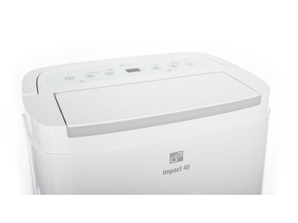 Odvlhčovač vzduchu G21 Impact 40 od české značky G21 má kapacitu 40 l za 24 hodin. Je vybaven 7l, dostatečně velkou nádržkou na kondenzát s průhledným indikátorem stavu. Pozorovat jej však ani nemusíte – odvlhčovač se při naplnění nádržky sám vypne. Odvlhčovač používá ekologické chladivo R290, které nepoškozuje ozónovou vrstvu.