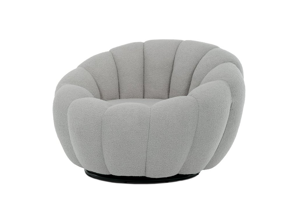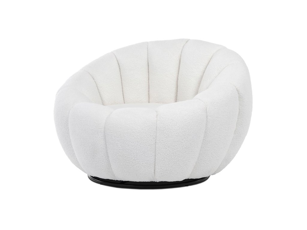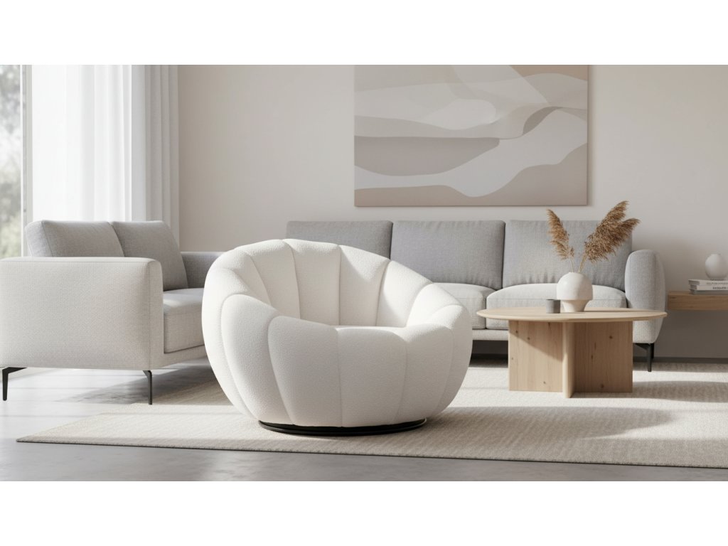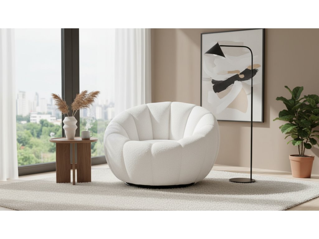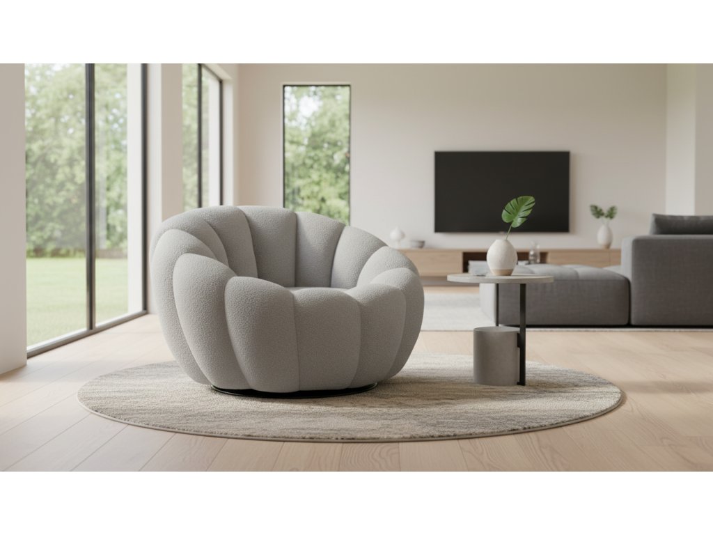 Relaxujte ve velkém stylu s křeslem OLAF čalouněným jemnou látkou Bouclé, která dodává interiéru nádech luxusu a zároveň poskytuje mimořádně příjemný pocit na dotek. Díky robustní kovové konstrukci a otočnému mechanismu o 360° se stane praktickým a spolehlivým prvkem vašeho obývacího pokoje.