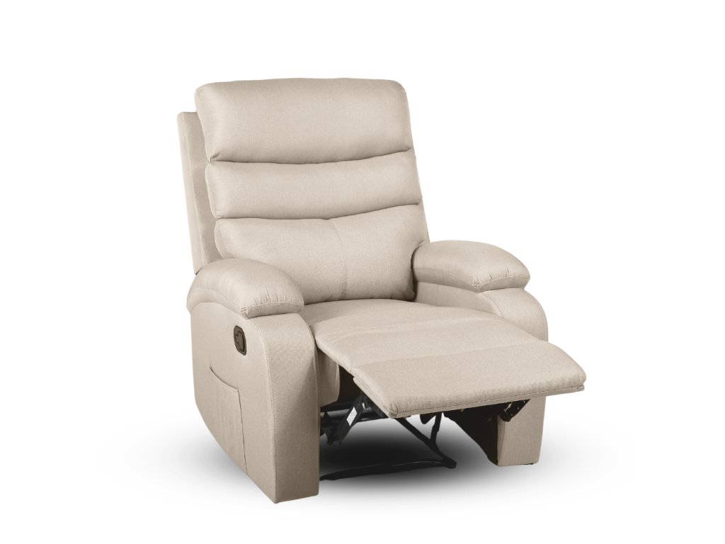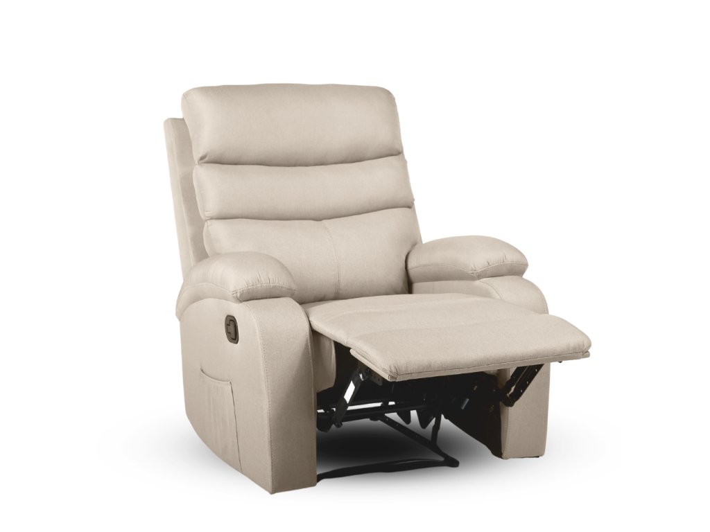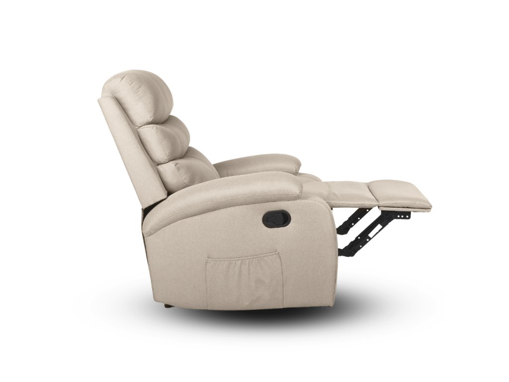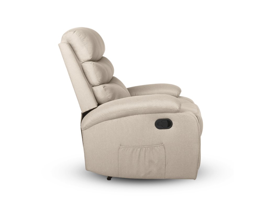 Díky propracované asynchronní polohovací mechanice lze opěrku zad i podnožku nastavit samostatně, takže si snadno najdete ideální polohu pro relaxaci. Bohaté polstrování z měkké pěny poskytuje maximální pohodlí, zatímco kvalitní látkový potah v béžovém odstínu je příjemný na dotek a odolný vůči každodennímu používání. Stabilní konstrukce z kovu a dřeva zaručuje pevnost, zatímco praktická kapsa na boku nabízí místo pro ovladač nebo knihu.