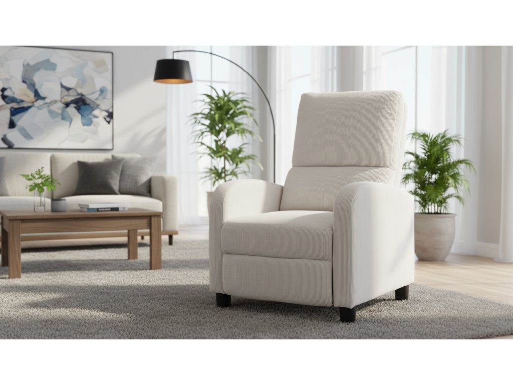 Polohovací křeslo JONAS spojuje moderní design s maximálním pohodlím. Jemný manšestrový potah dodává křeslu luxusní vzhled i příjemný pocit při sezení, zatímco černé plastové nohy zajišťují stabilitu a dlouhou životnost. Nadčasové barevné provedení vytváří kontrast, který podtrhuje sofistikovaný charakter tohoto křesla.