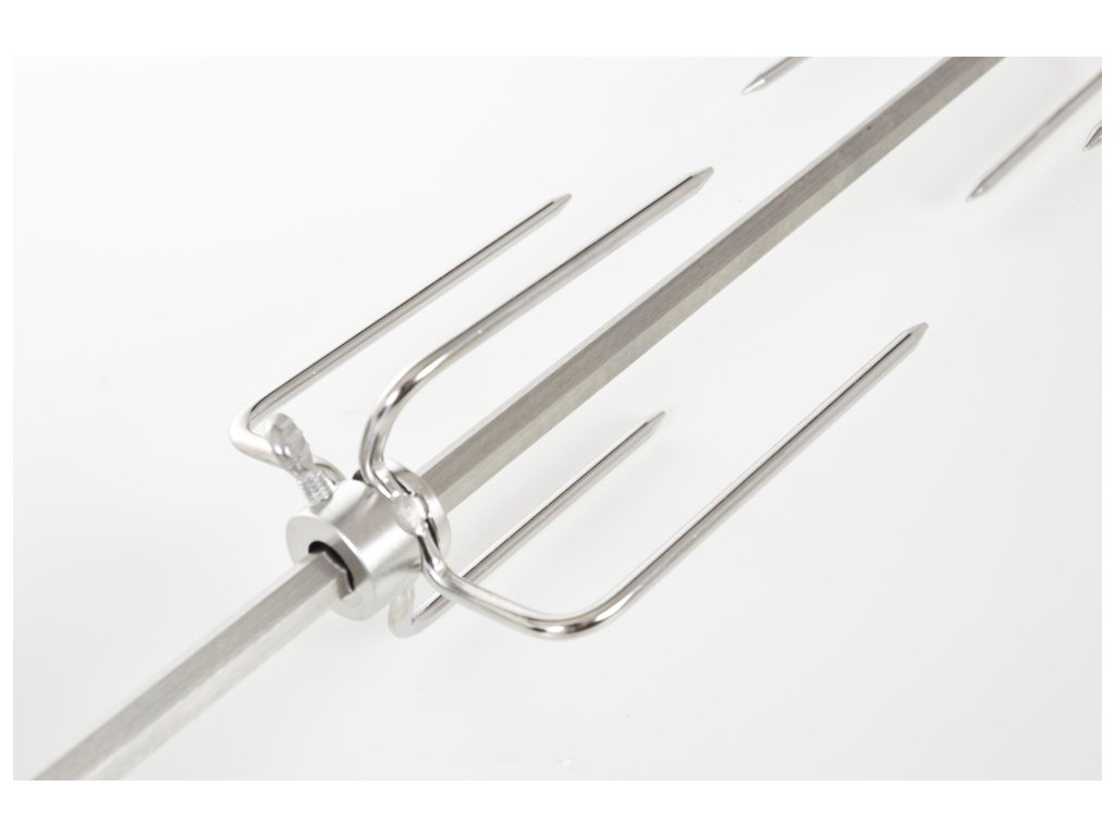 Grilovací jehla s motorem je vyrobena z nerezové oceli a z obou stran je opatřena čtyřmi jehlicemi s aretačními šrouby, díky kterým si můžete jehlice nastavit podle vlastní potřeby.