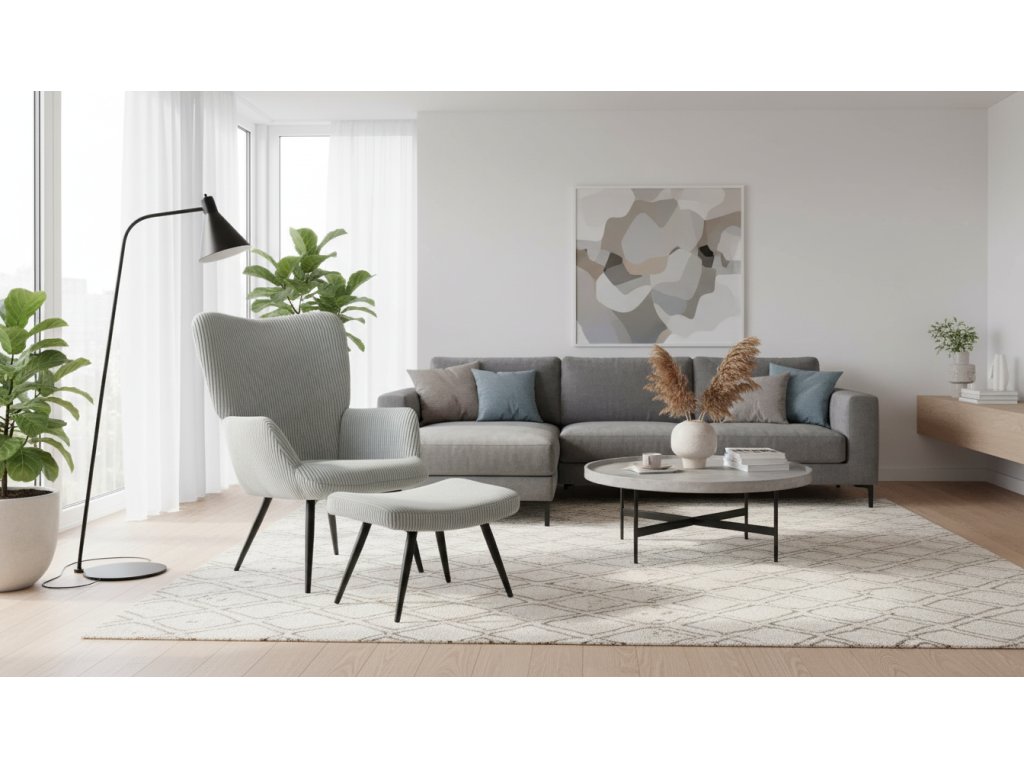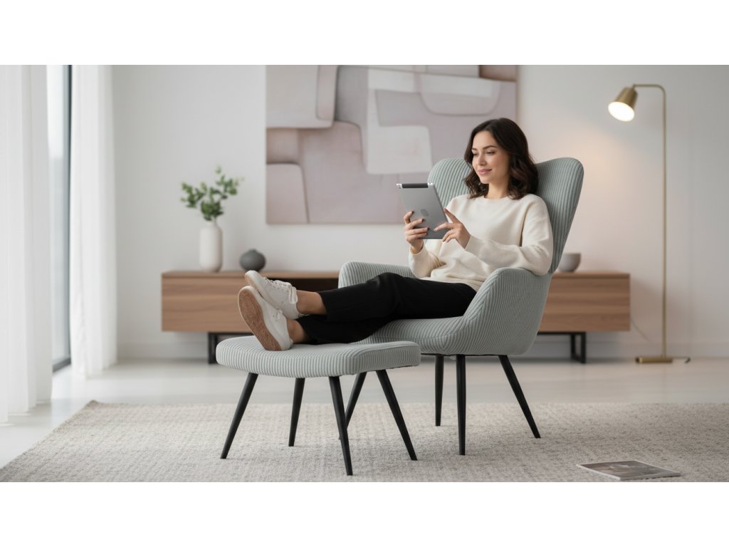 Součástí je designově sladěná podnožka, která nejen podtrhuje celkový vzhled, ale především přispívá k pohodlí při čtení, sledování televize nebo relaxaci. Křeslo není otočné ani rozkládací, čímž si zachovává svou jednoduchost, stabilitu a funkční čistotu.