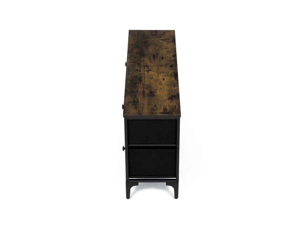 Komoda LINEA v sobě spojuje retro styl a praktickou funkčnost. Textilní čela zásuvek s MDF výplní jsou ozdobena jedinečným vintage potiskem, který navozuje atmosféru starých amerických barů a jazzových klubů. Celkový vzhled doplňuje deska v dekoru starého dřeva a černá kovová konstrukce se zdobenými nohami, jež dodávají nábytku stabilitu a nádech industriální elegance.